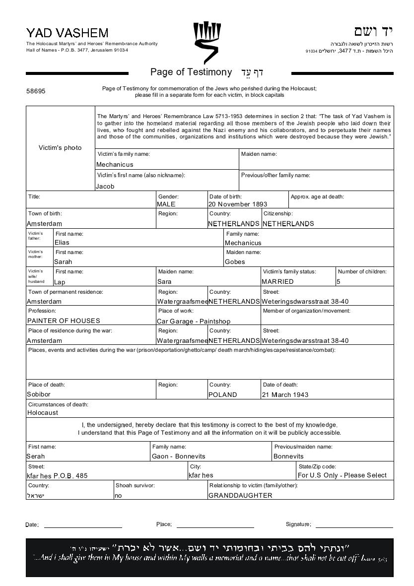 Jacob wurde in der Schoah ermordet. Todesort: Sobibor, Polen im Jahr 21/03/1943.