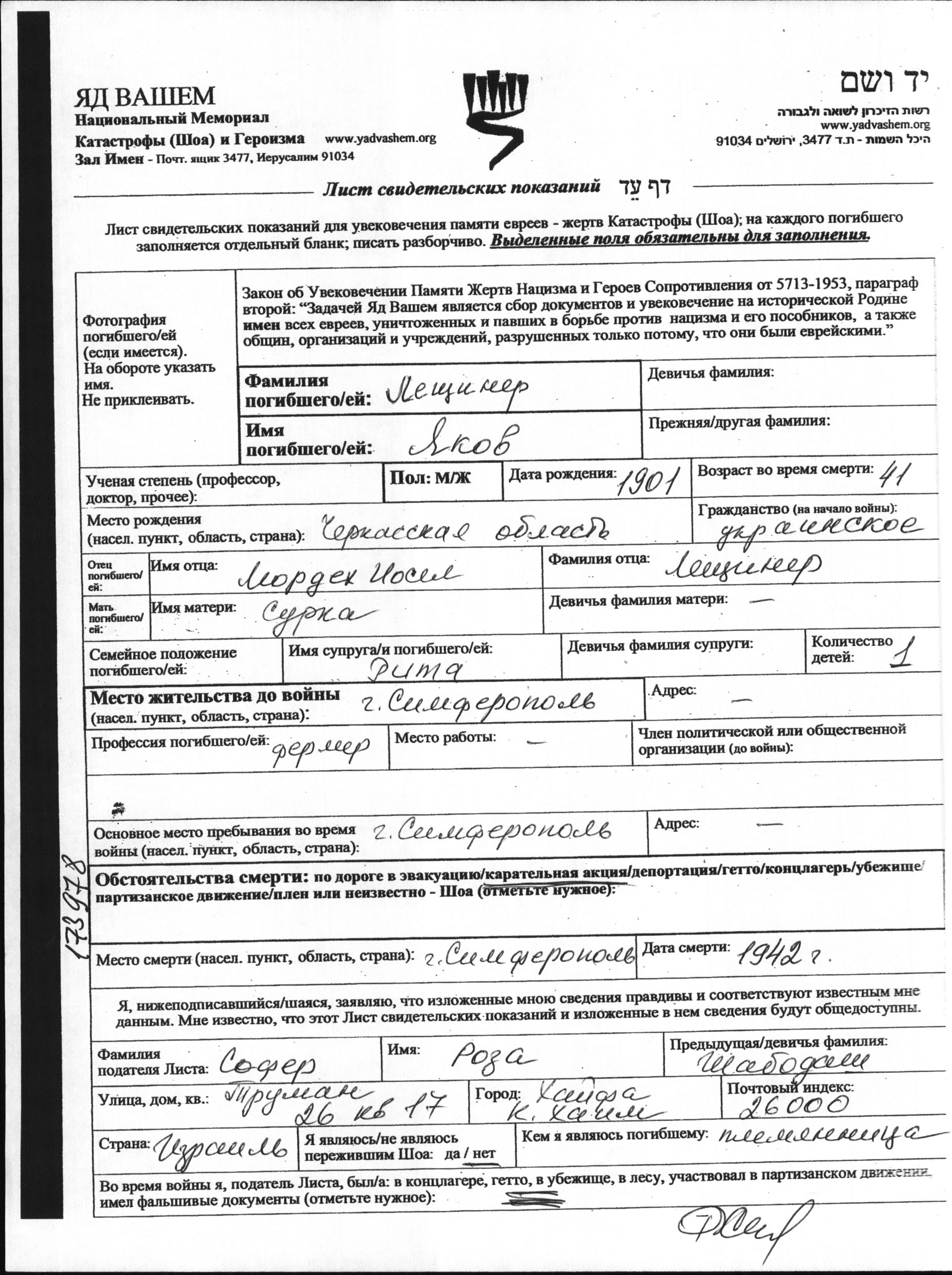 Yakov wurde in der Schoah ermordet. Todesort: Simferopol, Russland (UdSSR) im Jahr 1942.