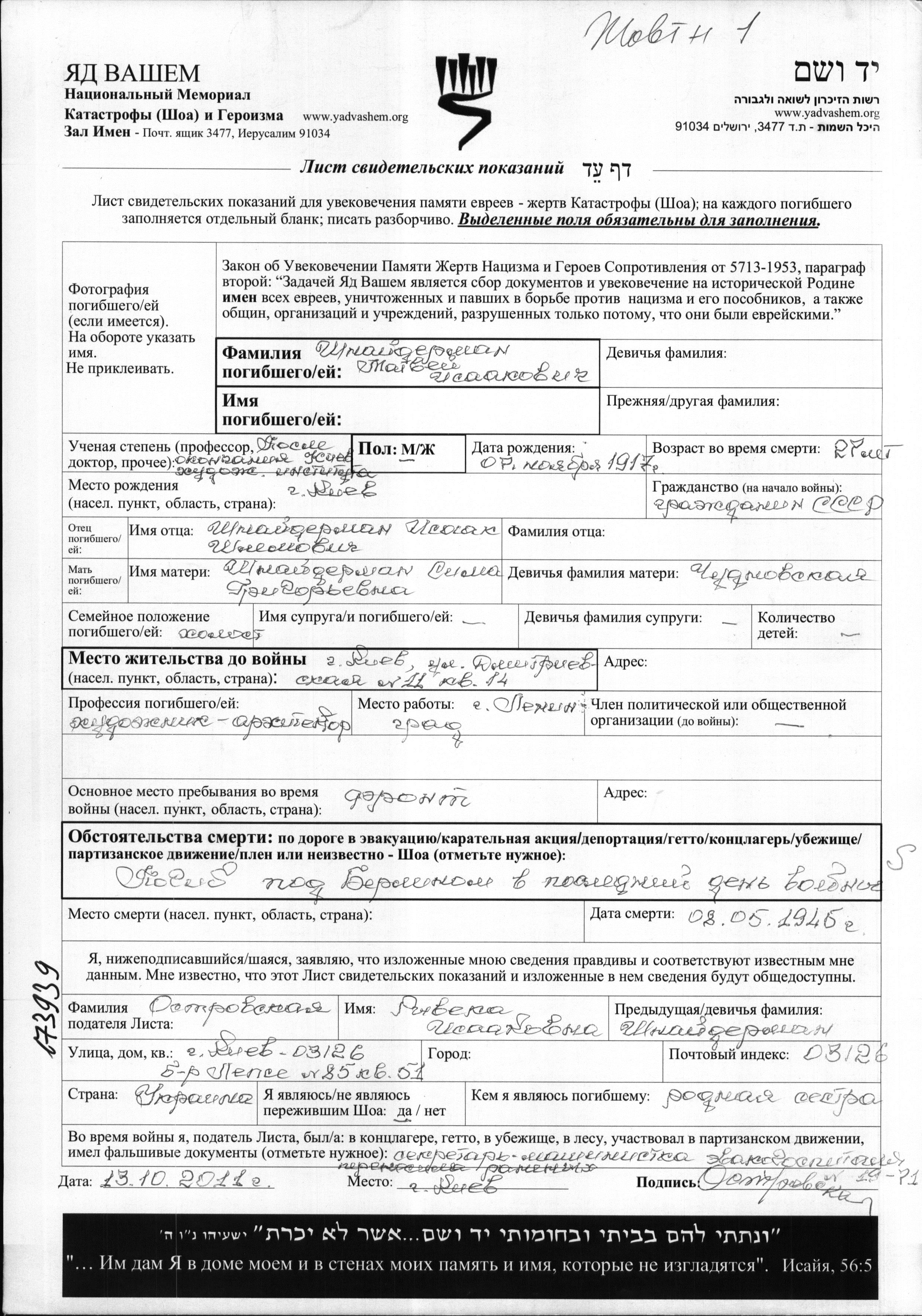 Shnayderman Matvey 1917 Kiev, Ukraine (UdSSR) Gedenkblatt