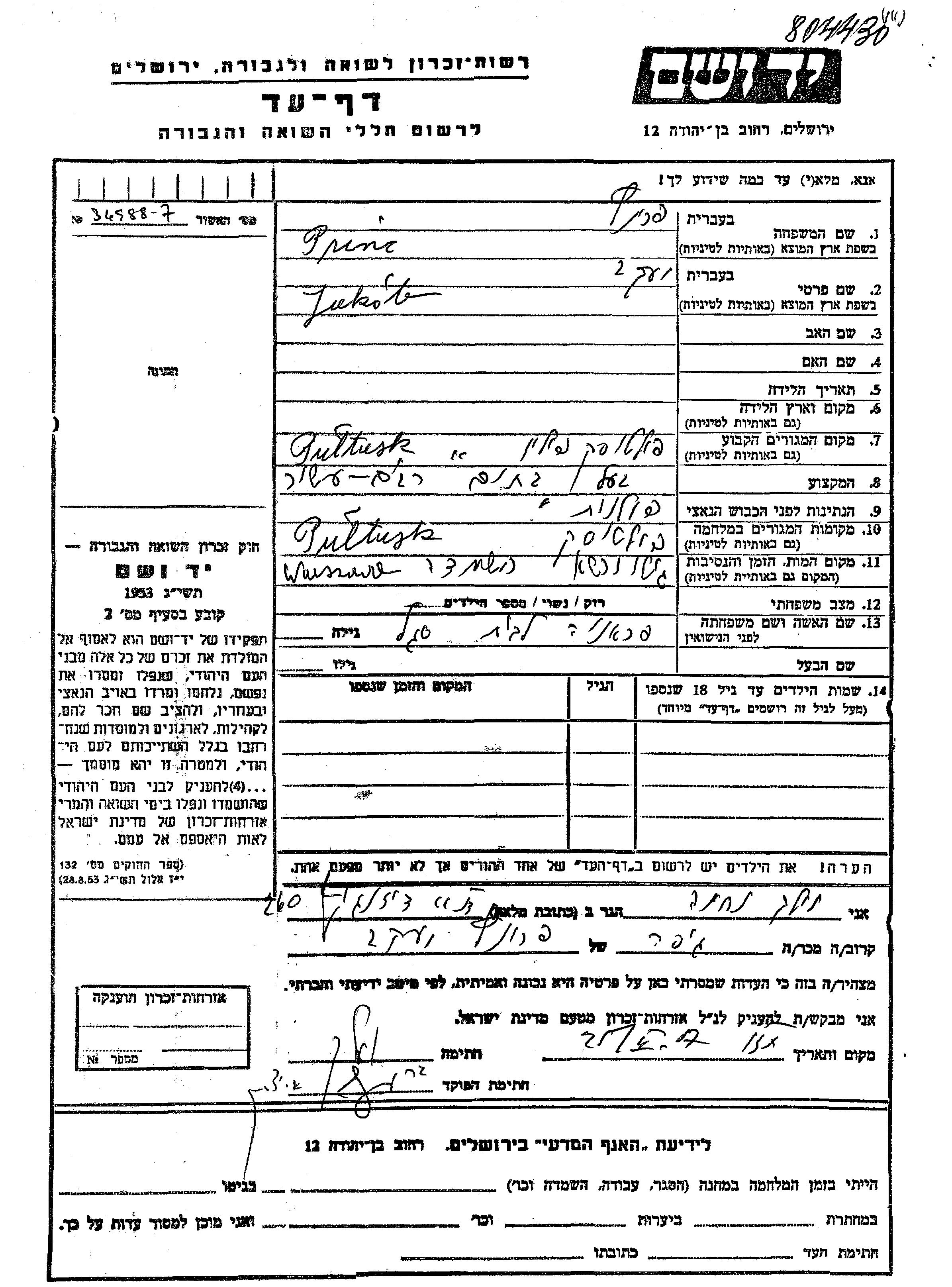 Jakob Princ. Er war mit Frania, geb. Segal Verheiratet. Vor dem Zweiten Weltkrieg lebte er in Pultusk, Polen. Während des Krieges war er in Pultusk, Polen.