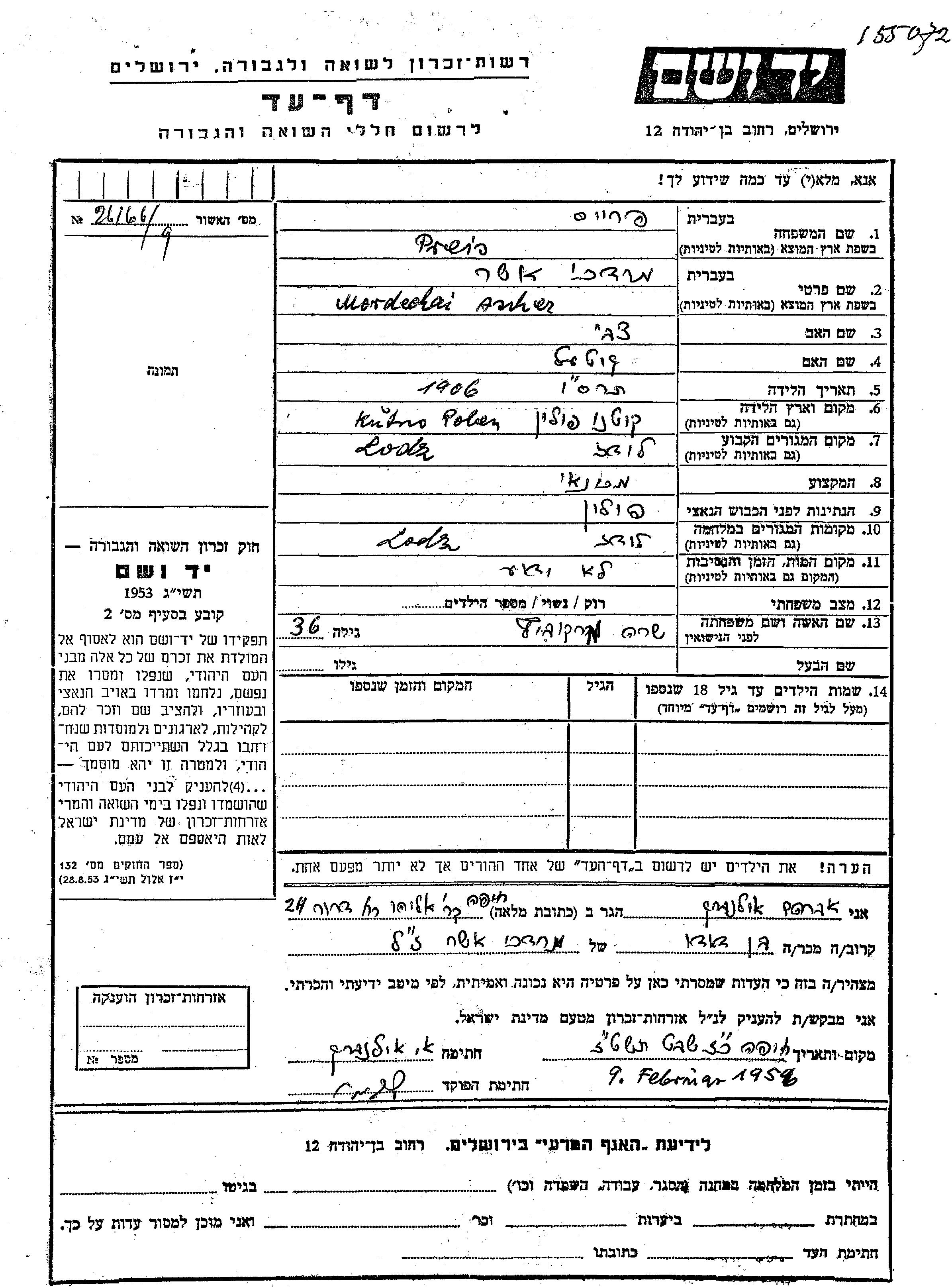 Preis Mordechai Asher 1906 Lodz, Polen Gedenkblatt