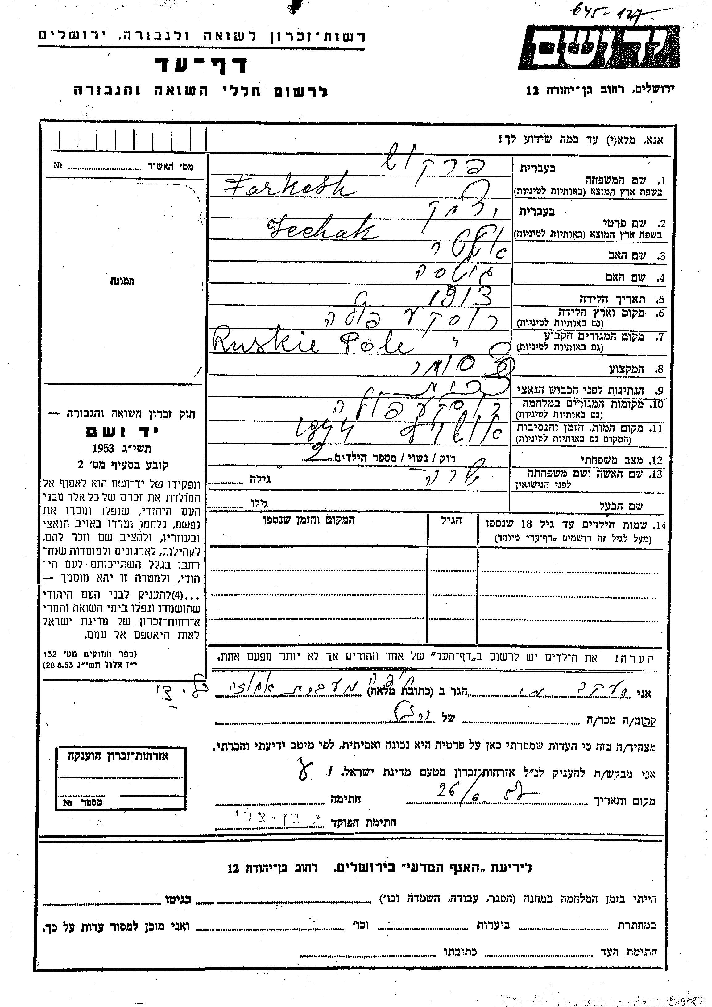Icchak Farkosh Perkush wurde im Jahr 1913 in Ruske Pole, Tschechoslowakei geboren. Er war der Sohn von Alter und Guta. Er war Kaufmann/-frau und mit Sara Verheiratet. Vor dem Zweiten Weltkrieg lebte er in Ruske Pole, Tschechoslowakei. Während des Krieges war er in Ruske Pole, Tschechoslowakei.