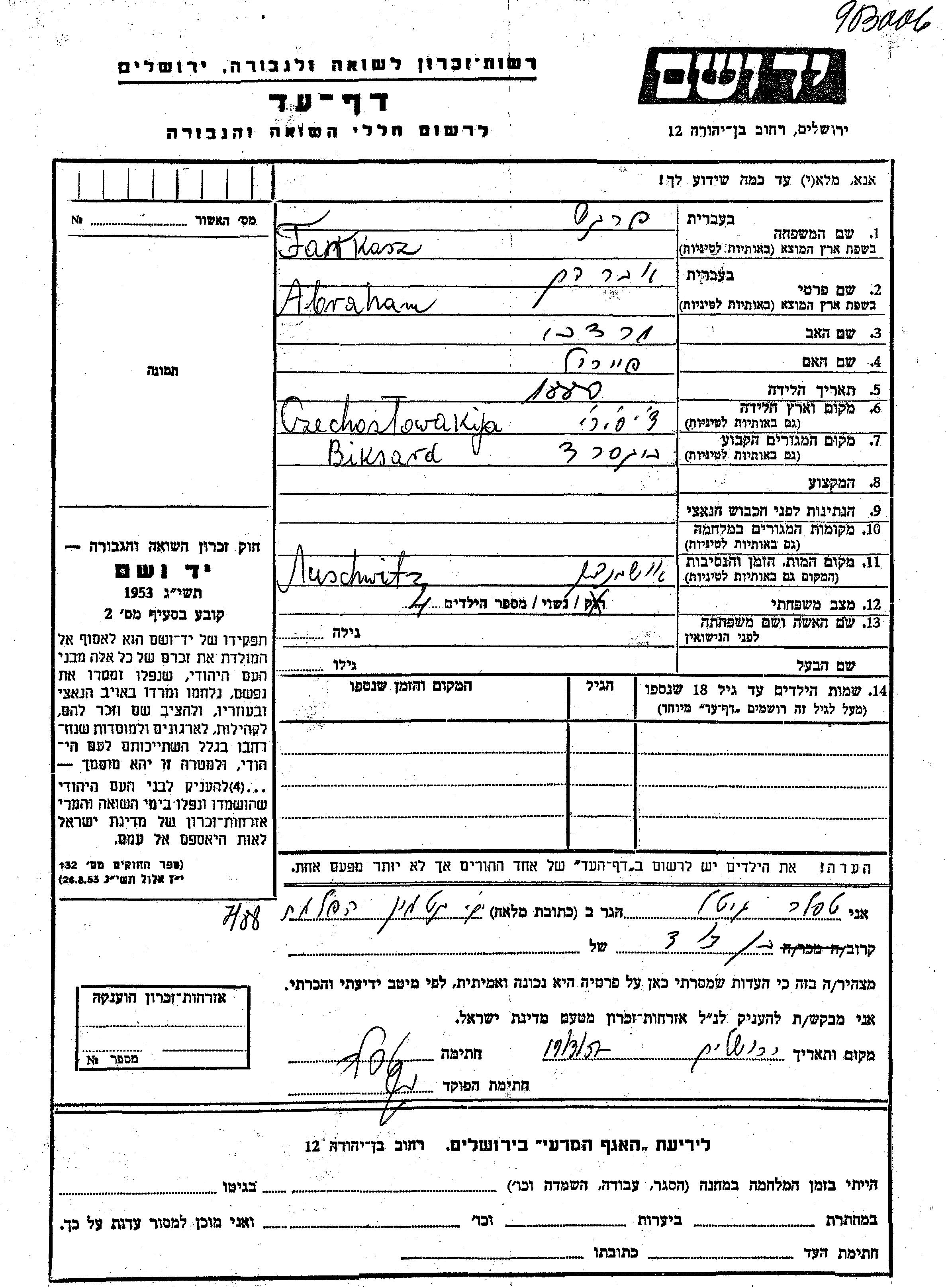 Abraham Farkasz wurde im Jahr 1880 in Tschechoslowakei geboren. Er war der Sohn von Mordekhai und Perel. Er war Verheiratet. Vor dem Zweiten Weltkrieg lebte er in Biksard, Tschechoslowakei.