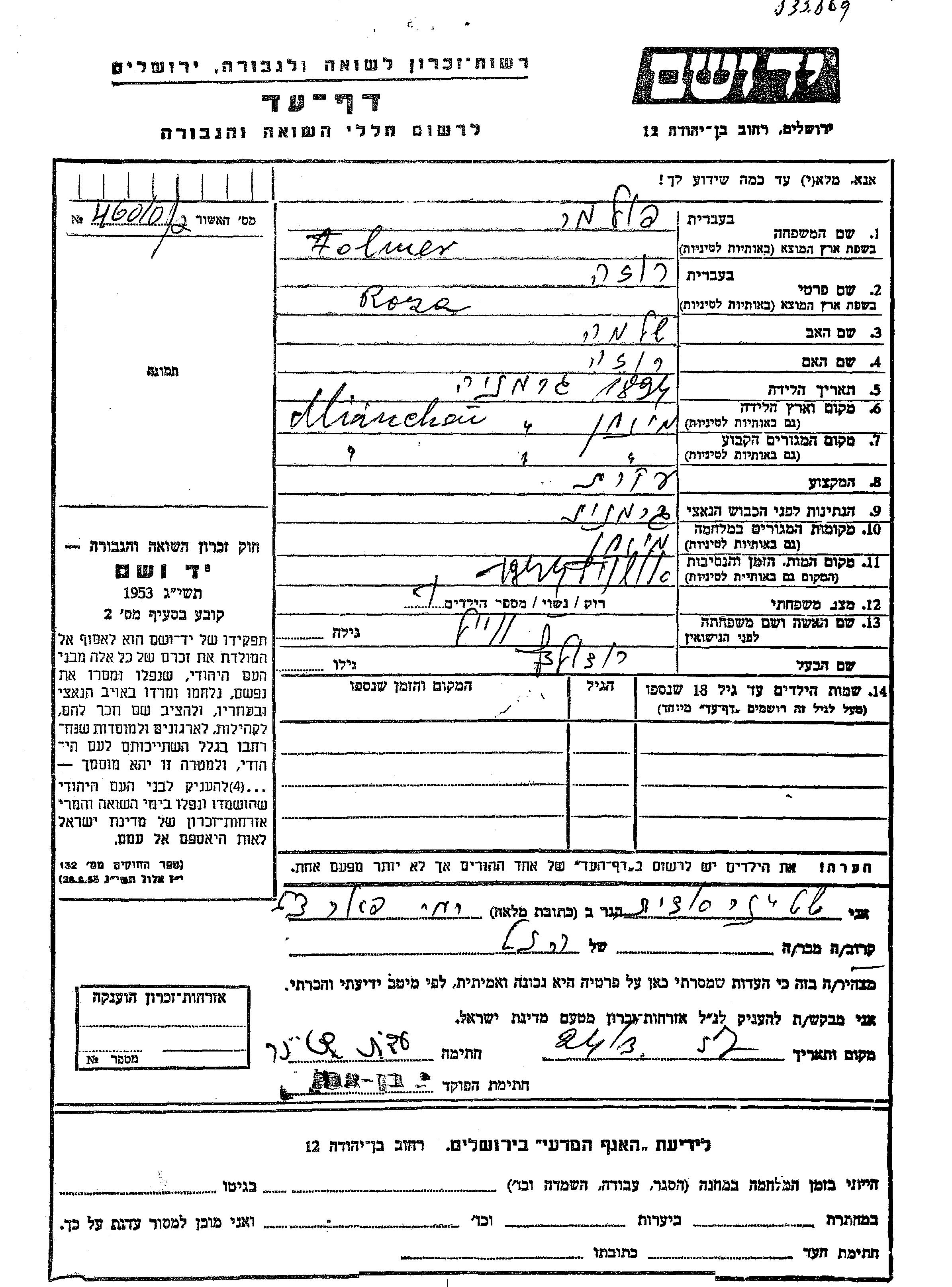 Roza Folmer, geb. Veil wurde im Jahr 1894 in Munchen, Deutsches Reich geboren. Sie war die Tochter von Shlomo und Roza. Sie war Hausfrau und mit Rudolf Verheiratet. Vor dem Zweiten Weltkrieg lebte sie in Munchen, Deutsches Reich. Während des Krieges war sie in Munchen, Deutsches Reich.