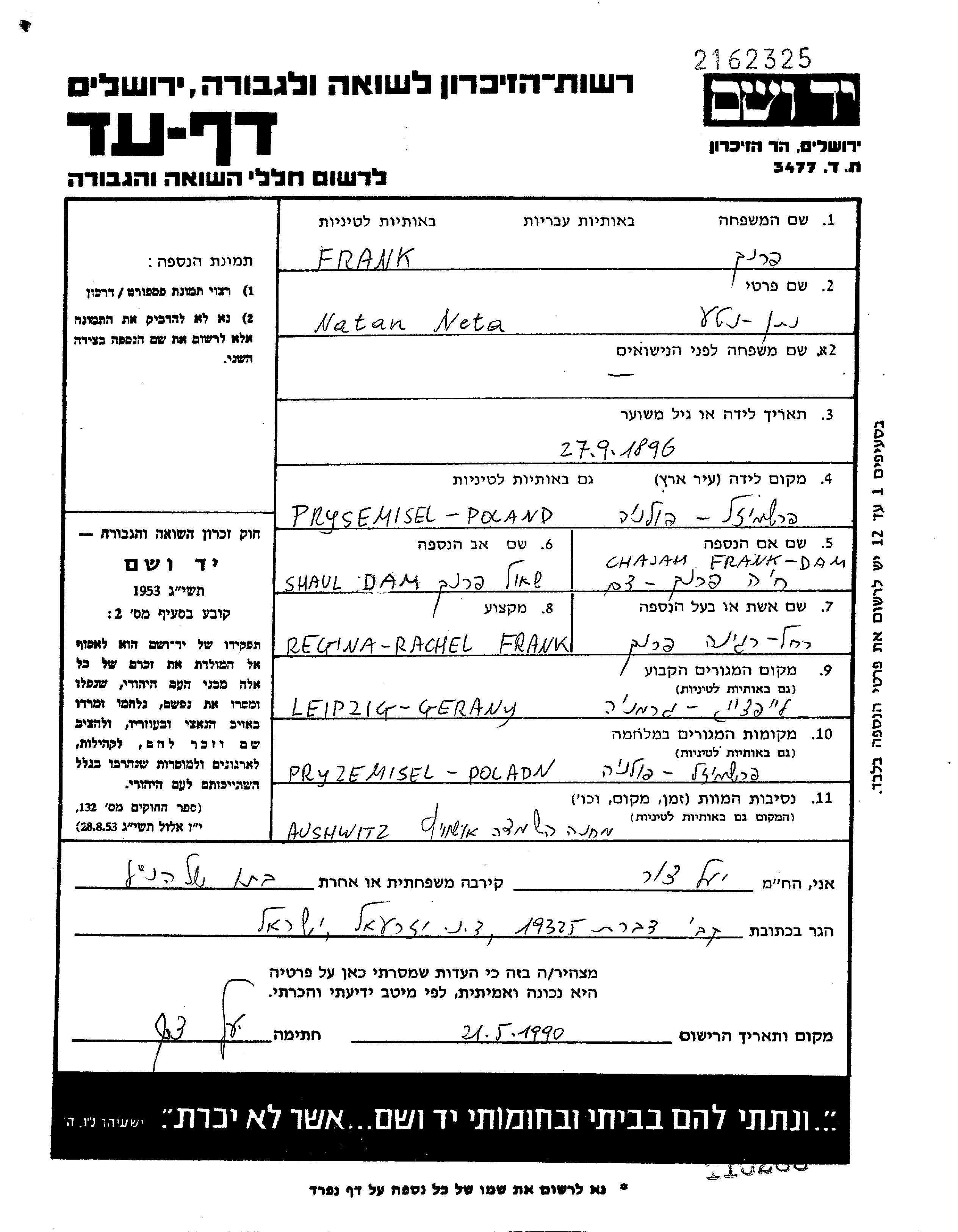 Neta Nute Neta Dam Frank wurde im Jahr 1896 in Przemysl, Polen geboren. Er war der Sohn von Shaul und Chajah. Er war mit Rachel Regina Verheiratet. Vor dem Zweiten Weltkrieg lebte er in Leipzig, Deutsches Reich. Während des Krieges war er in Przemysl, Polen.