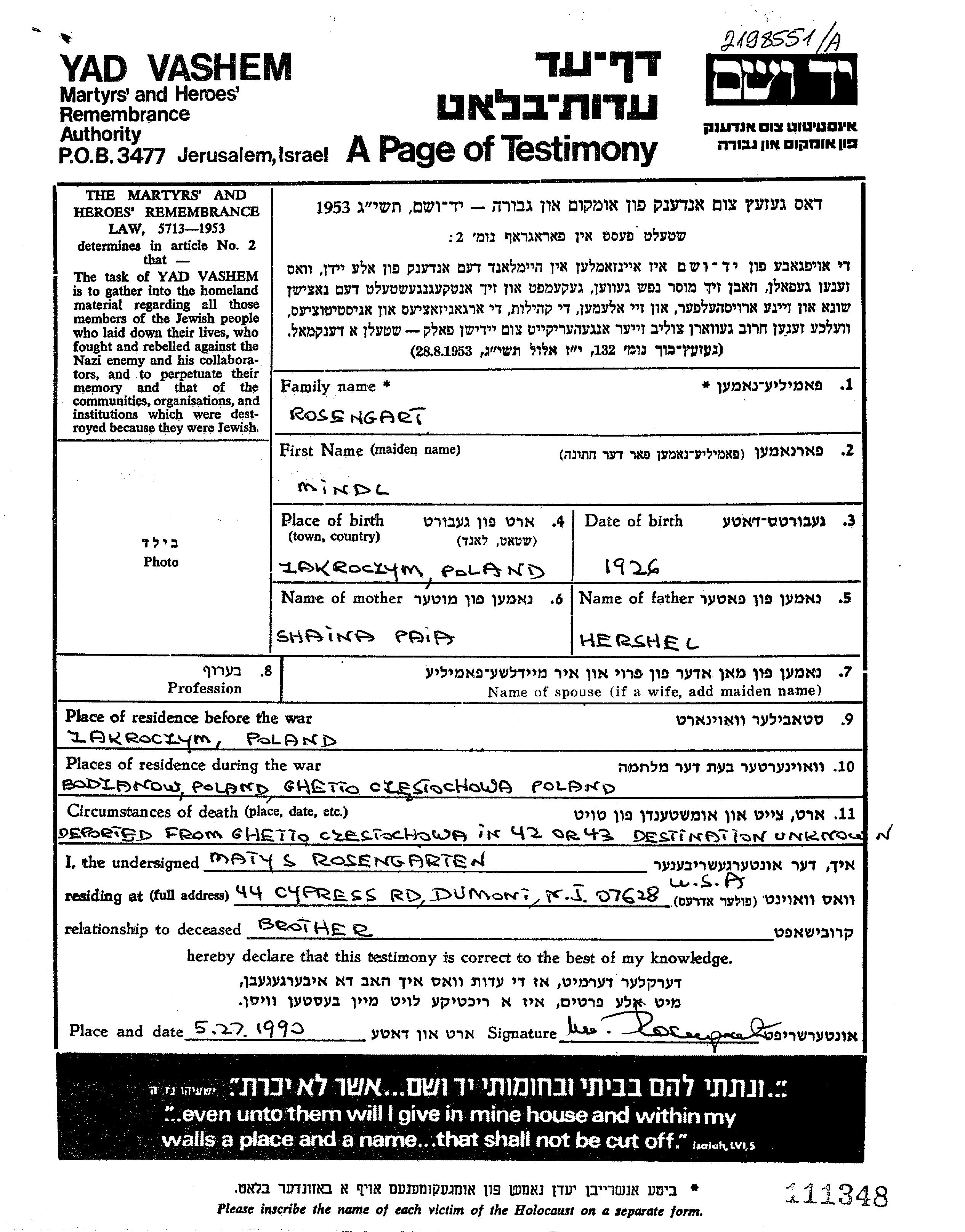 Mindl Rosengarten wurde im Jahr 1926 in Zakroczyn, Polen geboren. Sie war die Tochter von Hershel und Shania Paia. Sie war Kind. Vor dem Zweiten Weltkrieg lebte sie in Zakroczyn, Polen. Während des Krieges war sie in Czestochowa, Polen.