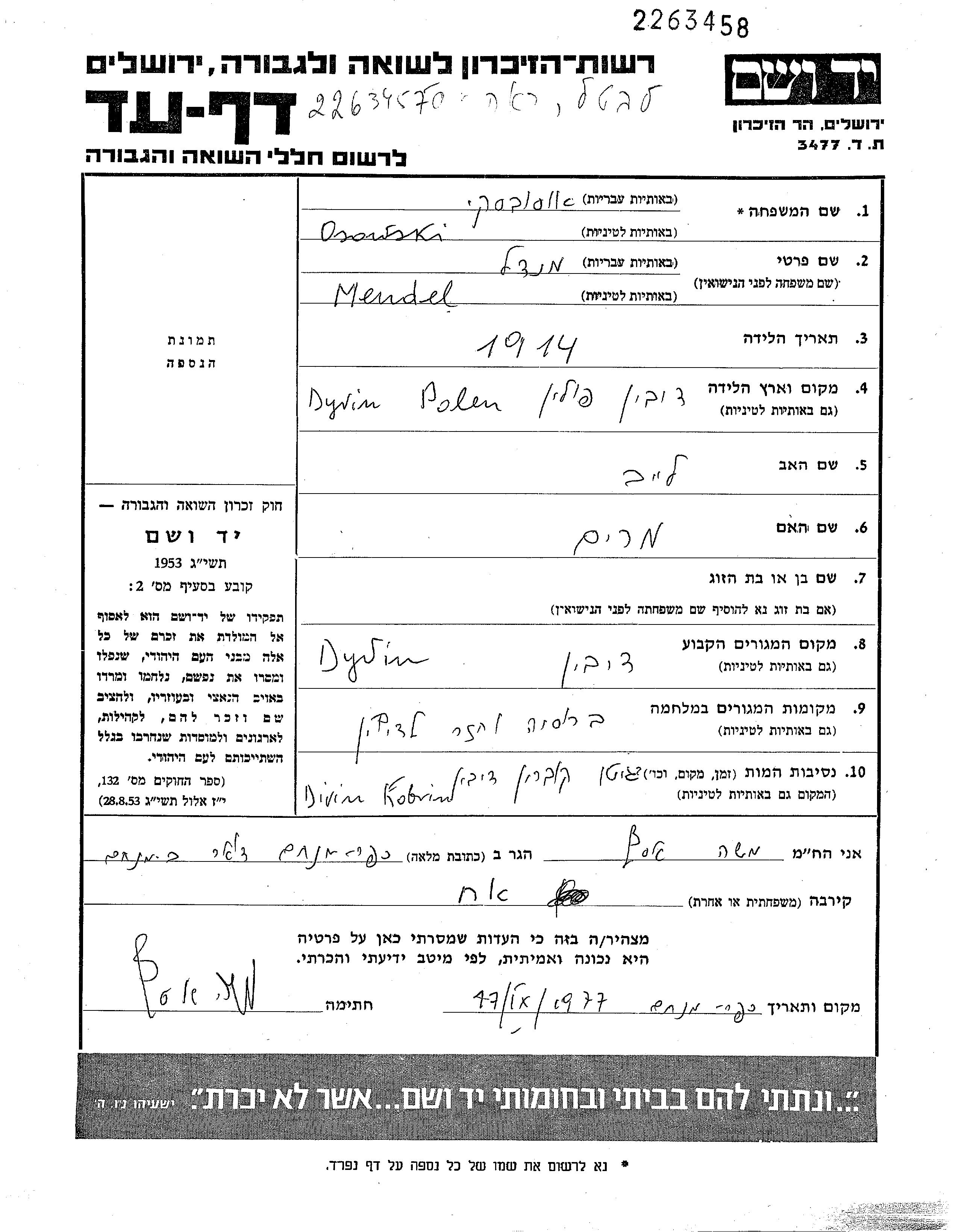 Mendel Osowski wurde im Jahr 1914 in Dyvin, Polen geboren. Er war der Sohn von Leib und Miriam. Vor dem Zweiten Weltkrieg lebte er in Dyvin, Polen. Während des Krieges war er in Dyvin, Polen.