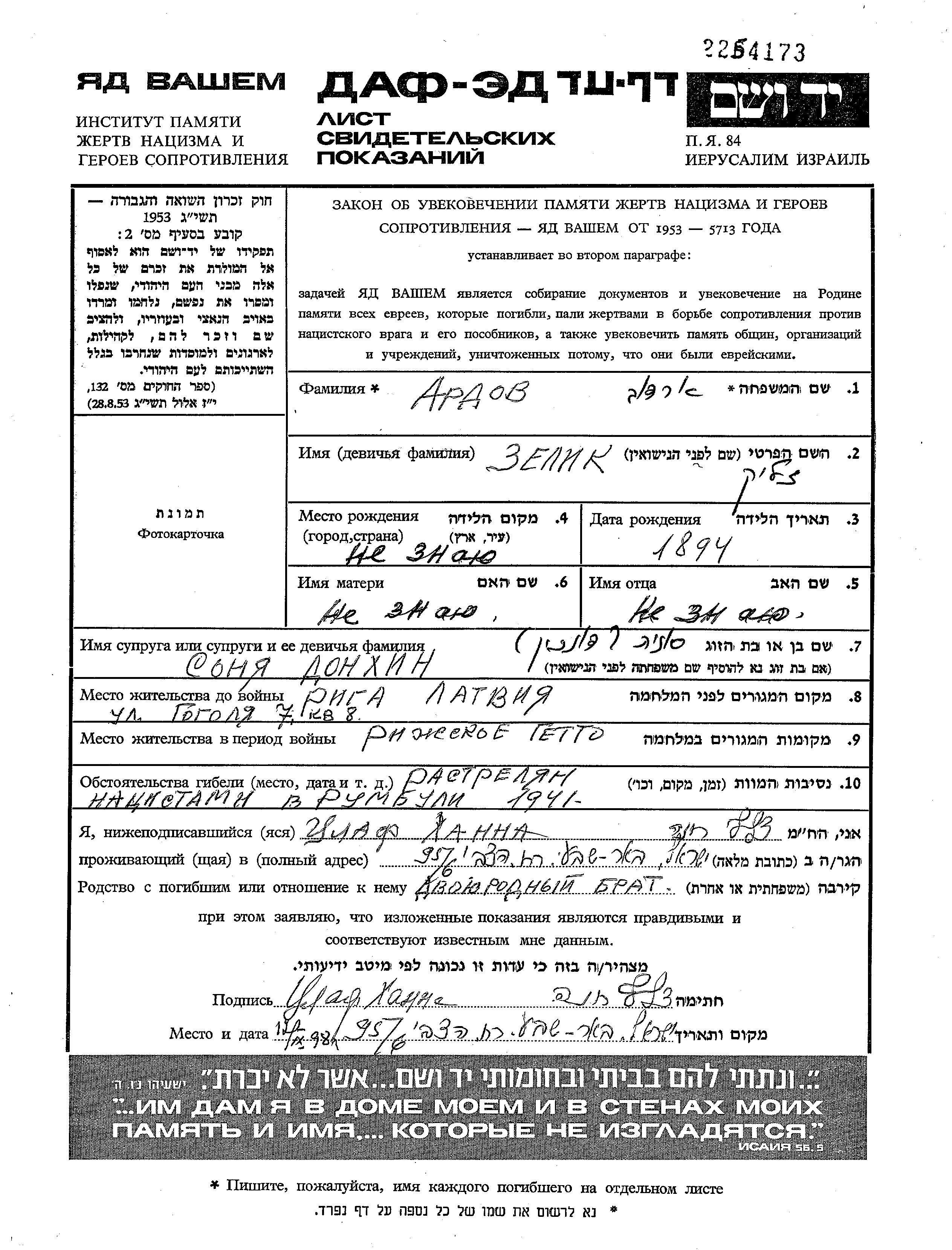 Zelig Ardov wurde im Jahr 1894 geboren. Er war mit Sonya, geb. Donkhin Verheiratet. Vor dem Zweiten Weltkrieg lebte er in Riga, Lettland. Während des Krieges war er in Riga, Lettland.
