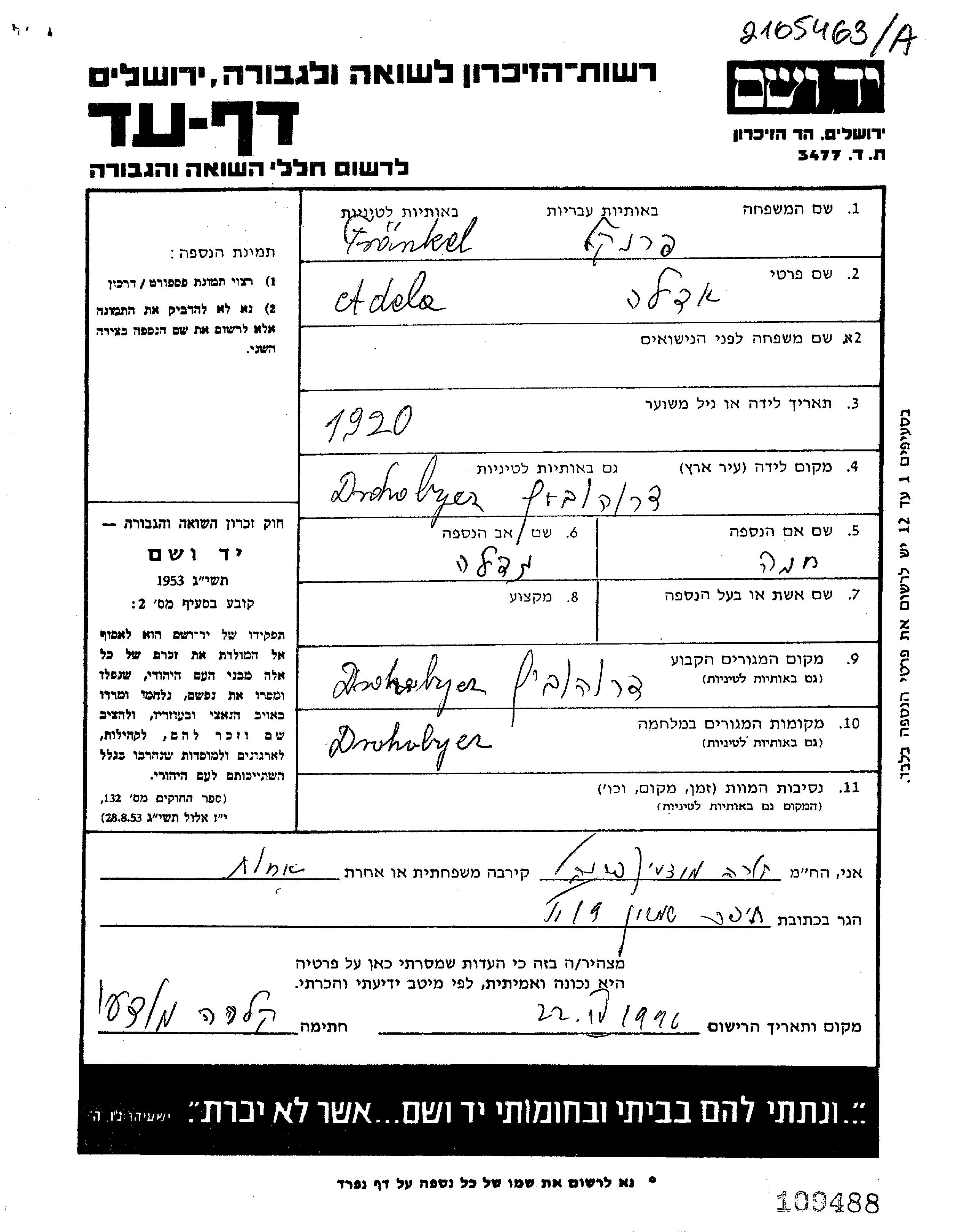 Adela Fronkel wurde im Jahr 1920 in Drohobycz, Polen geboren. Sie war die Tochter von Madla und Khema. Vor dem Zweiten Weltkrieg lebte sie in Drohobycz, Polen. Während des Krieges war sie in Drohobycz, Polen.