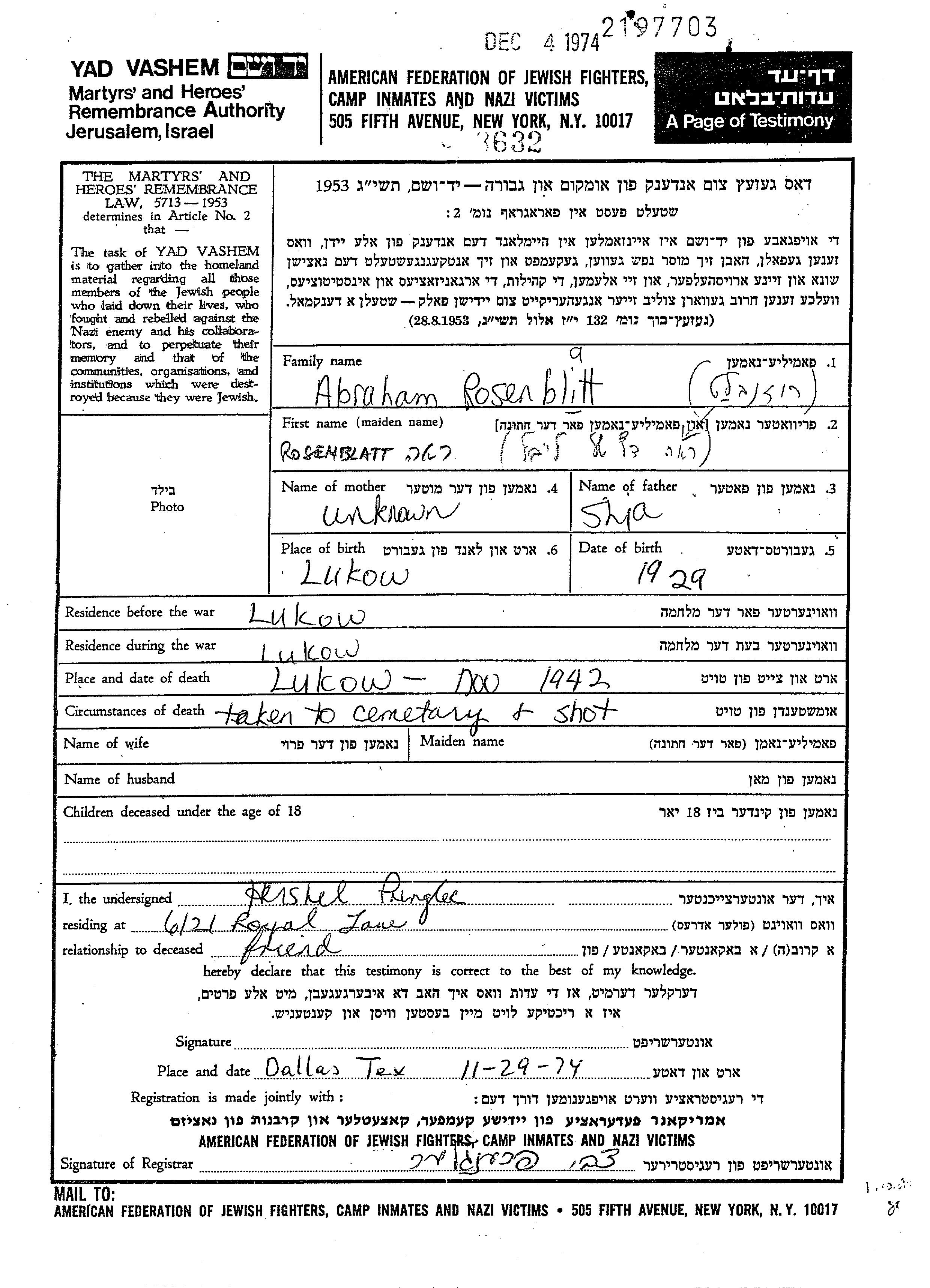 Abraham Rosenblatt wurde im Jahr 1929 in Lukow, Polen geboren. Er war der Sohn von Shaia Shia. Vor dem Zweiten Weltkrieg lebte er in Lukow, Polen. Während des Krieges war er in Lukow, Polen.