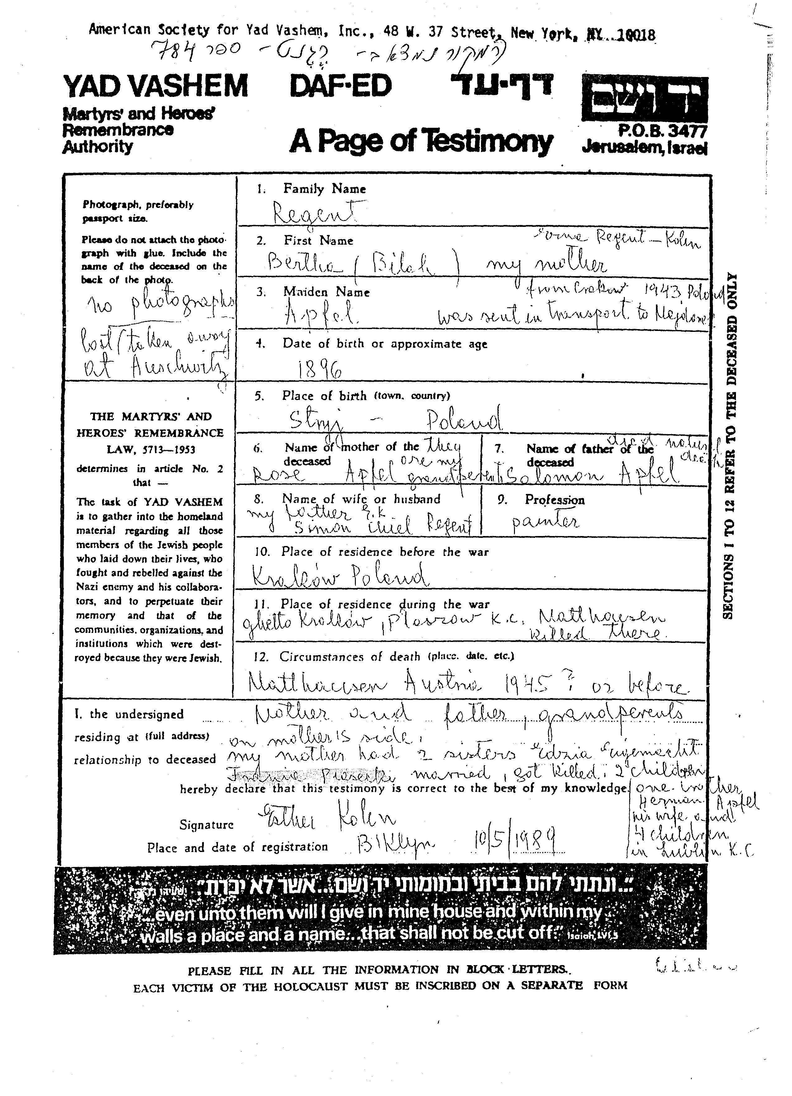 Bertha Bilah Regent, geb. Apfel wurde im Jahr 1896 in Stryj, Polen geboren. Sie war die Tochter von Solomon und Rose. Sie war Kunstmaler/-in und mit Simon Chiel Verheiratet. Vor dem Zweiten Weltkrieg lebte sie in Krolikow, Polen. Während des Krieges war sie in Krolikow, Polen.