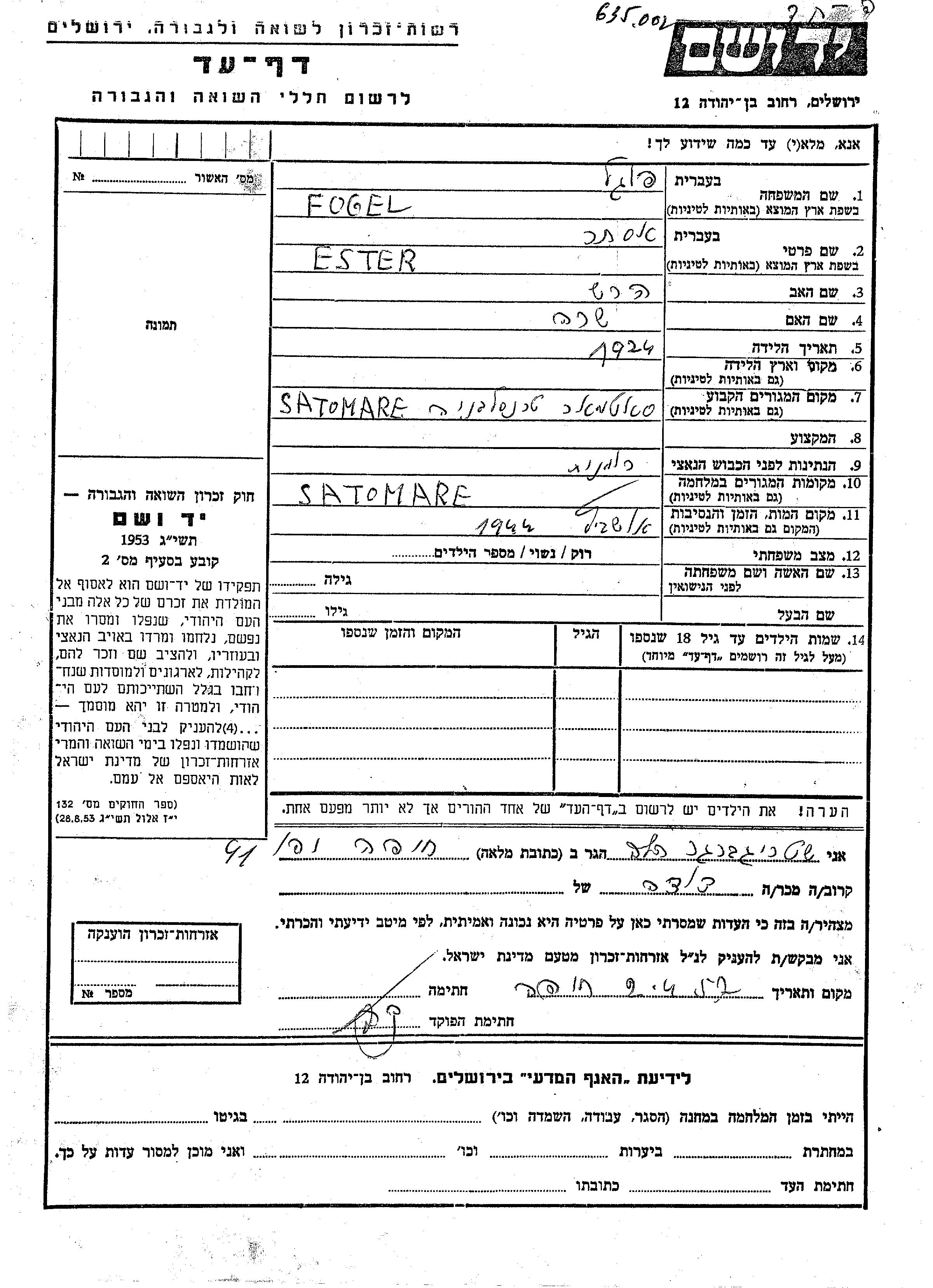 Fogel Ester 1924 Satomare, Rumänien Gedenkblatt