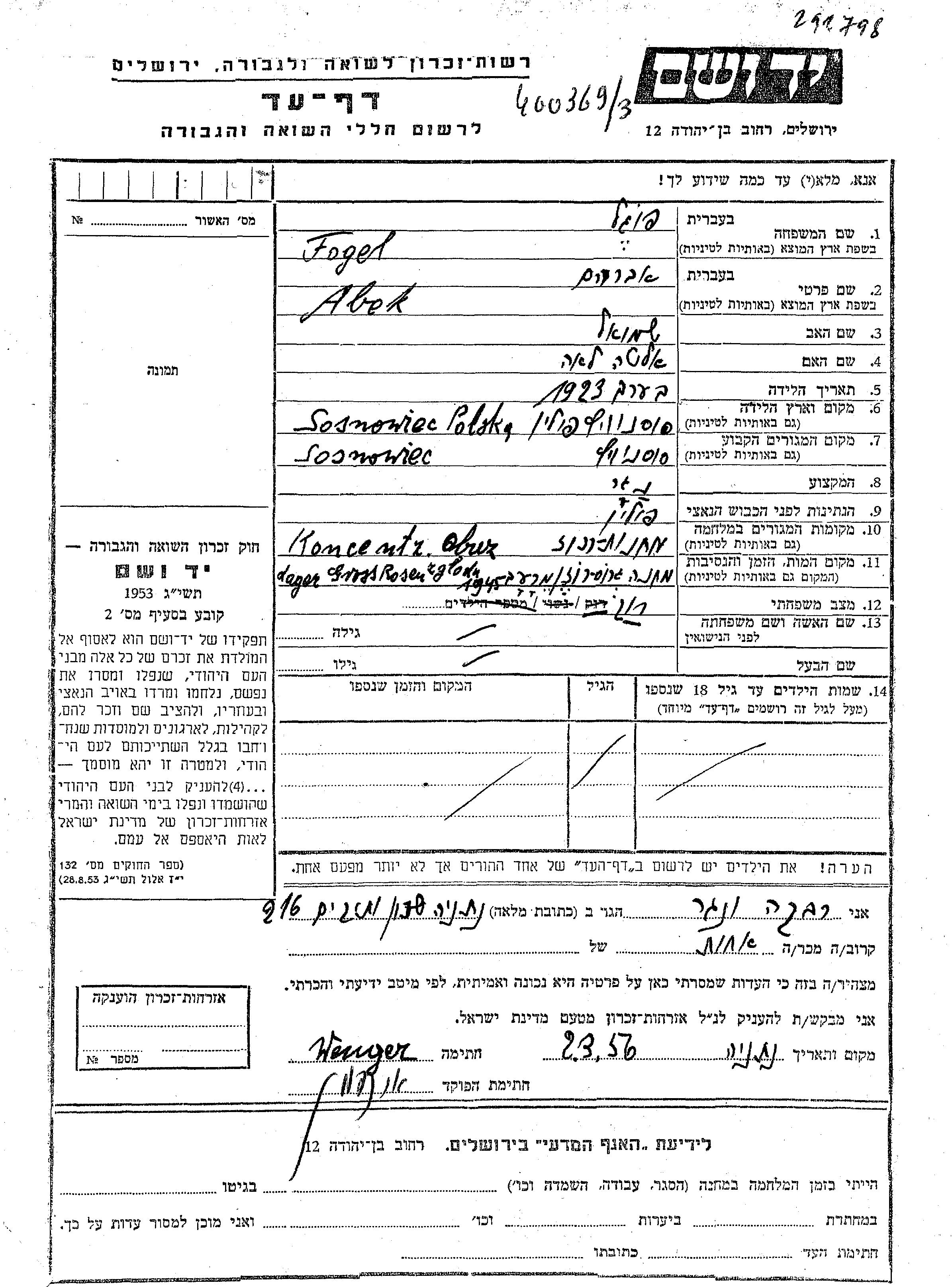 Fogel Abek Avraham 1923 Sosnowiec, Polen Gedenkblatt