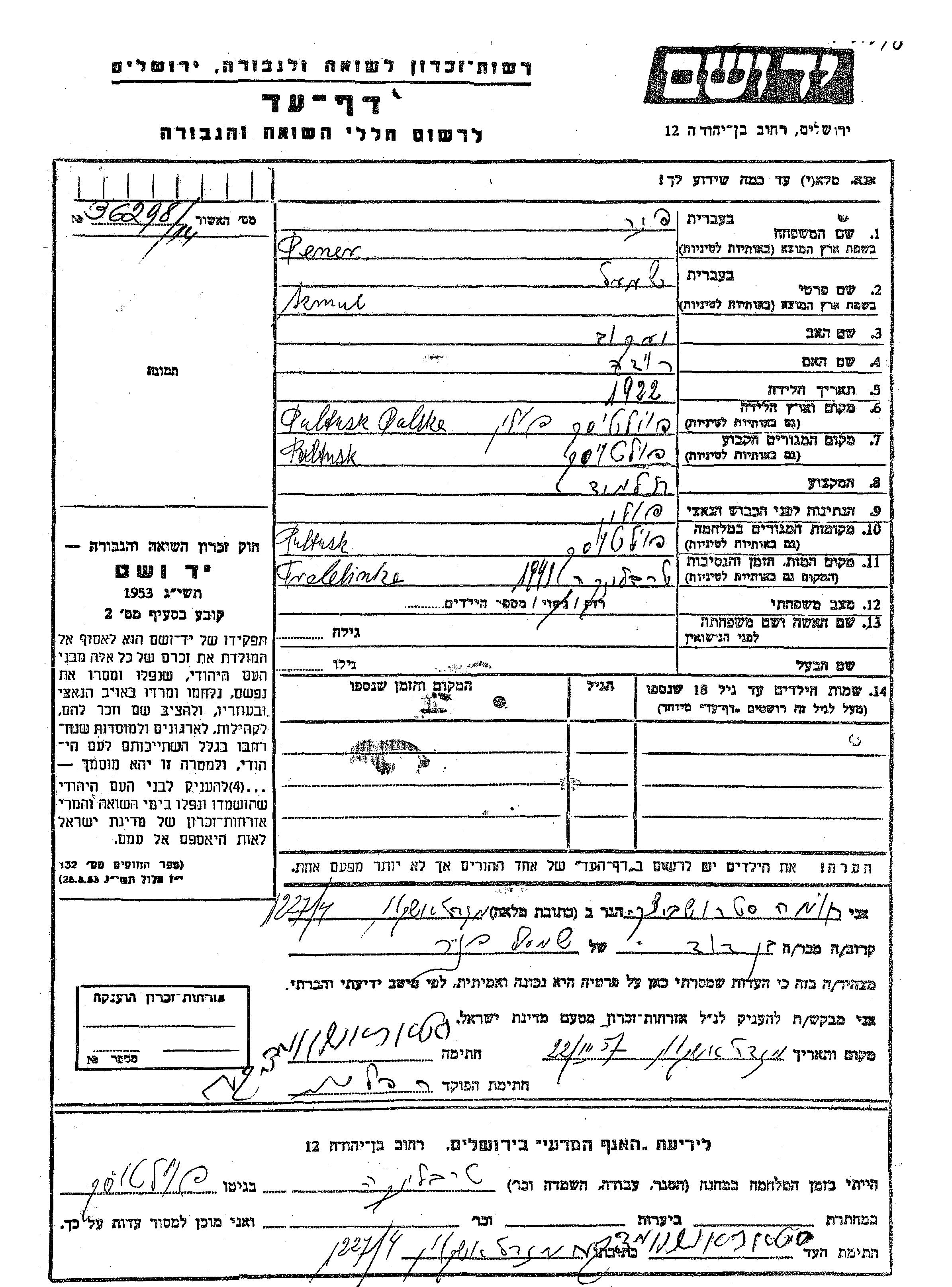 Szmul Pener wurde im Jahr 1922 in Pultusk, Polen geboren. Er war der Sohn von Yaakov und Vida. Er war Schüler/-in und Ledig. Vor dem Zweiten Weltkrieg lebte er in Pultusk, Polen. Während des Krieges war er in Pultusk, Polen.