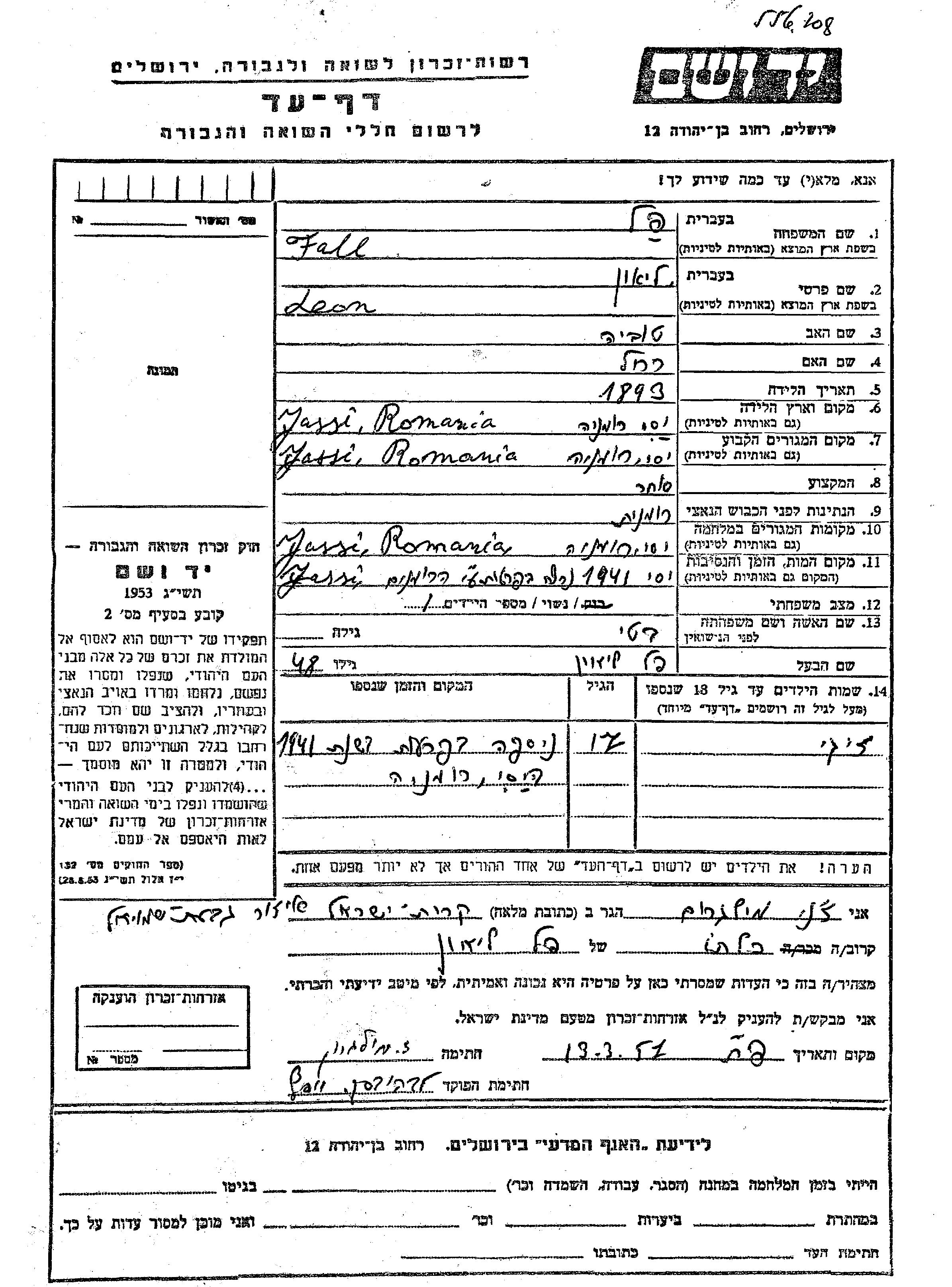 Lion Fall Pal wurde im Jahr 1893 in Jassi, Rumänien geboren. Er war der Sohn von Tuvia und Rakhel. Er war Kaufmann/-frau und mit Beti Verheiratet. Vor dem Zweiten Weltkrieg lebte er in Jassi, Rumänien. Während des Krieges war er in Jassi, Rumänien.