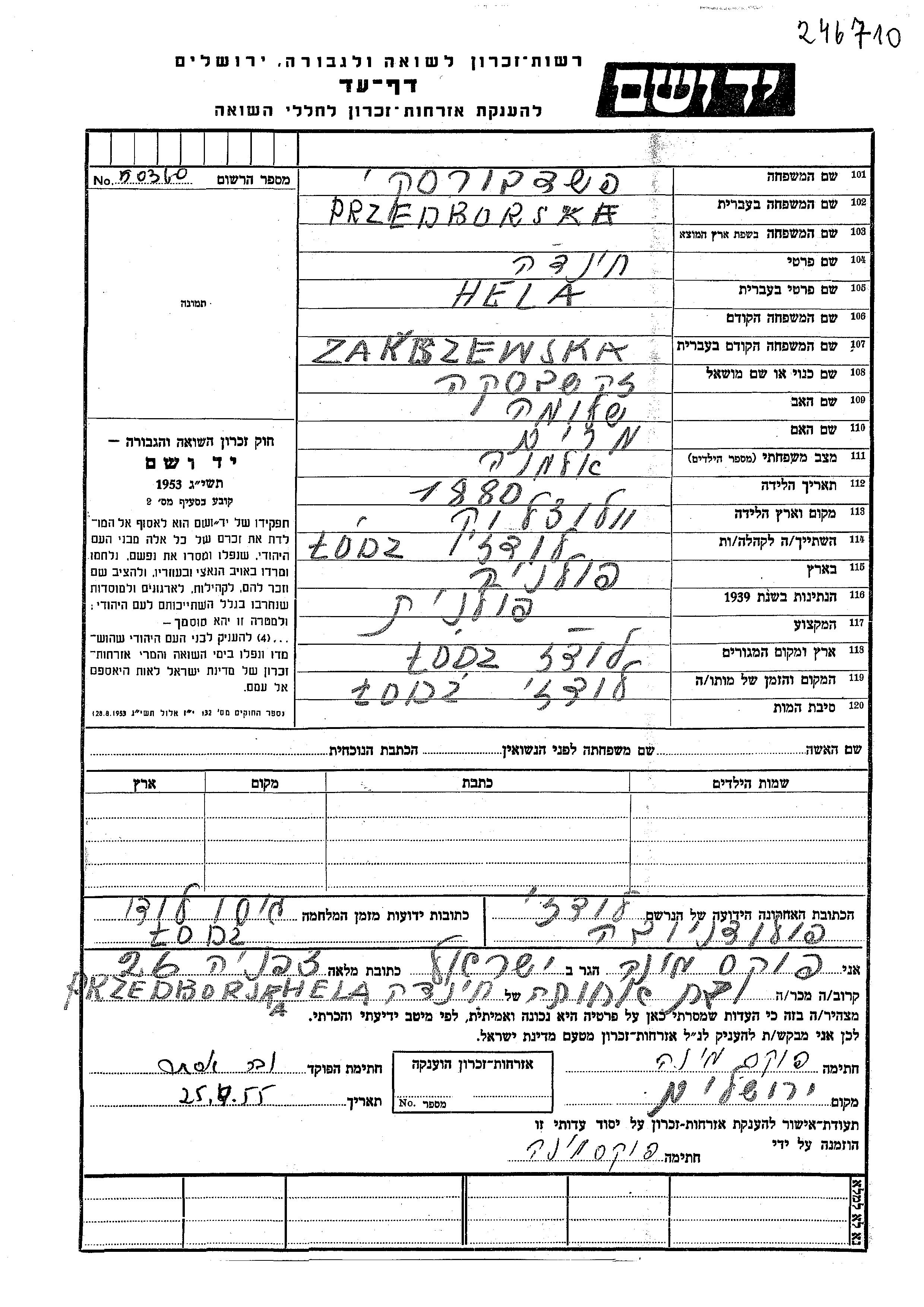Hinda Hela Przedborska, geb. Zakrzewska wurde im Jahr 1880 in Wloclawek, Polen geboren. Sie war die Tochter von Shlomo und Miriam. Sie war Witwe. Vor dem Zweiten Weltkrieg lebte sie in Lodz, Polen. Während des Krieges war sie in Lodz, Polen.