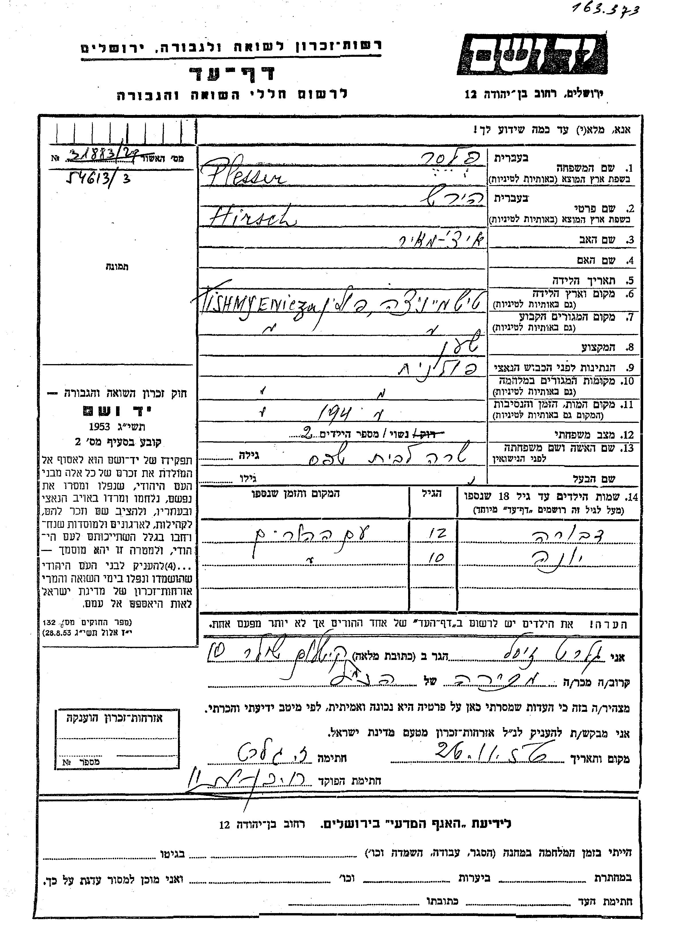 Hirsch wurde in der Schoah ermordet. Todesort: Tiszmienica, Polen.
