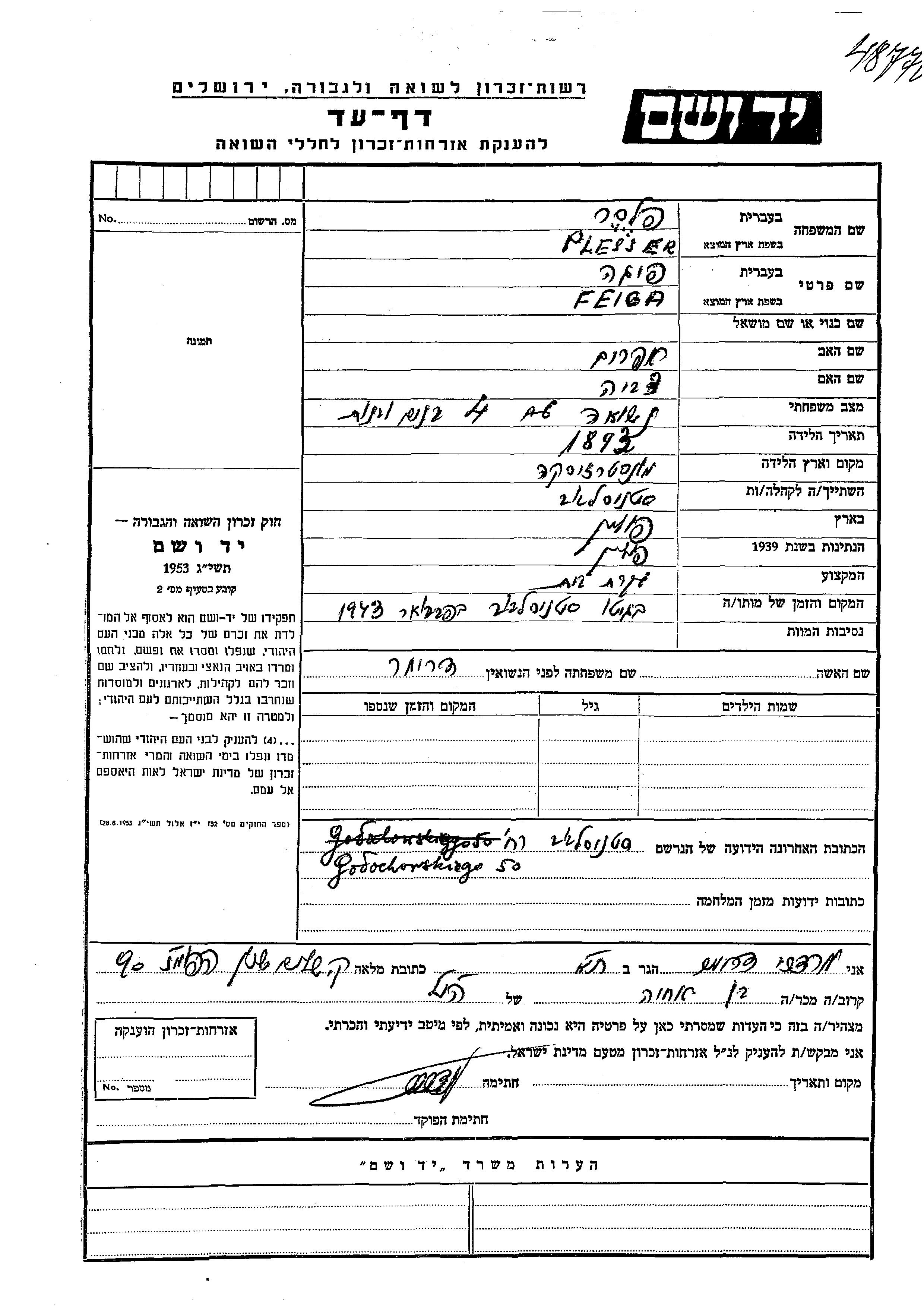 Feiga Plesser Flasser, geb. Drimer wurde im Jahr 1892 in Monasterzyska, Polen geboren. Sie war die Tochter von Efraim und Tzvia. Sie war Hausfrau und Verheiratet. Vor dem Zweiten Weltkrieg lebte sie in Stanislawow, Polen. Während des Krieges war sie in Stanislawow, Polen.