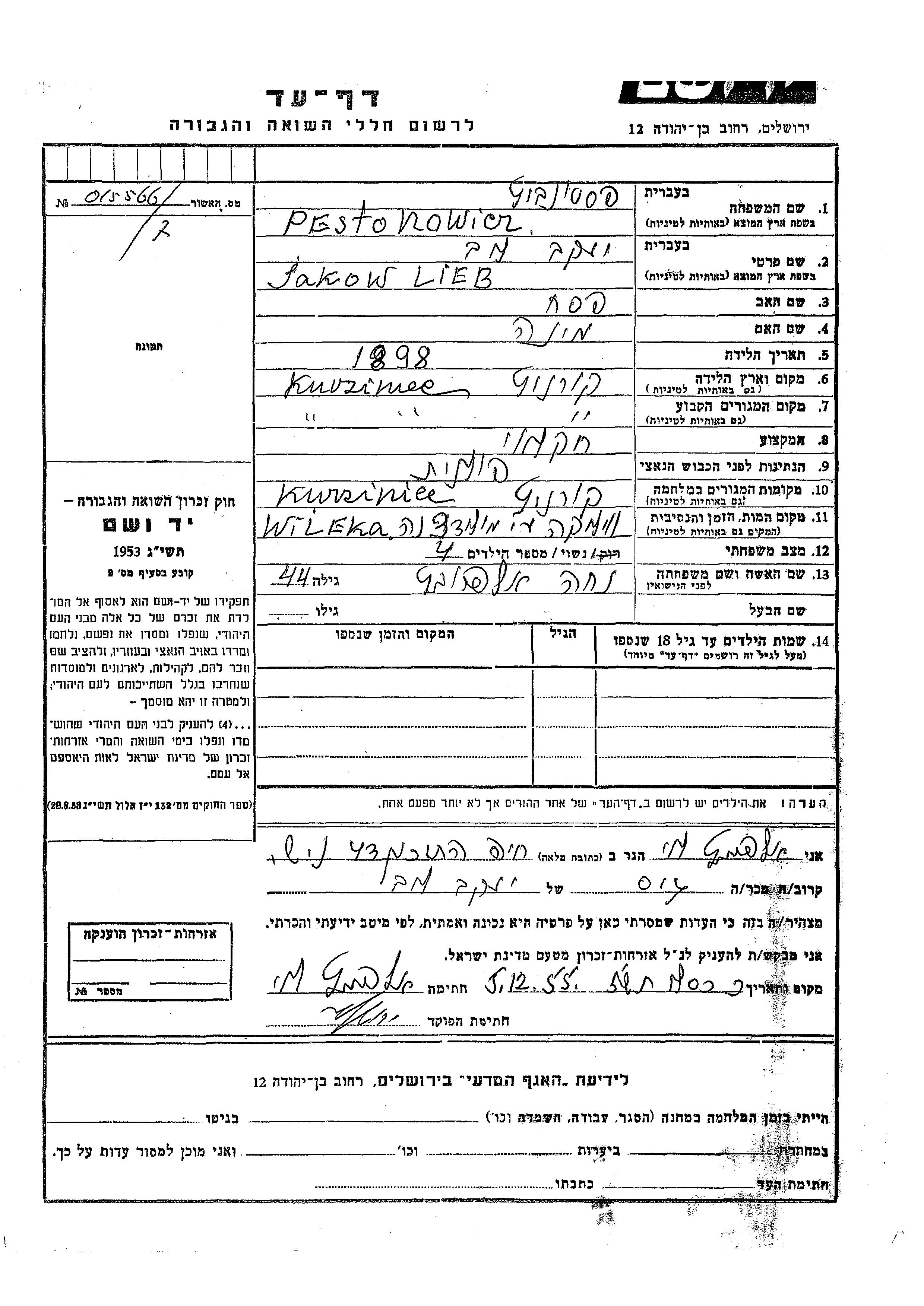Jakow Lieb Pestonowicz wurde im Jahr 1898 in Kurzeniec, Polen geboren. Er war der Sohn von Pesakh und Mina. Er war Landwirt und mit Nekha, geb. Alperovitz Verheiratet. Vor dem Zweiten Weltkrieg lebte er in Kurzeniec, Polen. Während des Krieges war er in Kurzeniec, Polen.