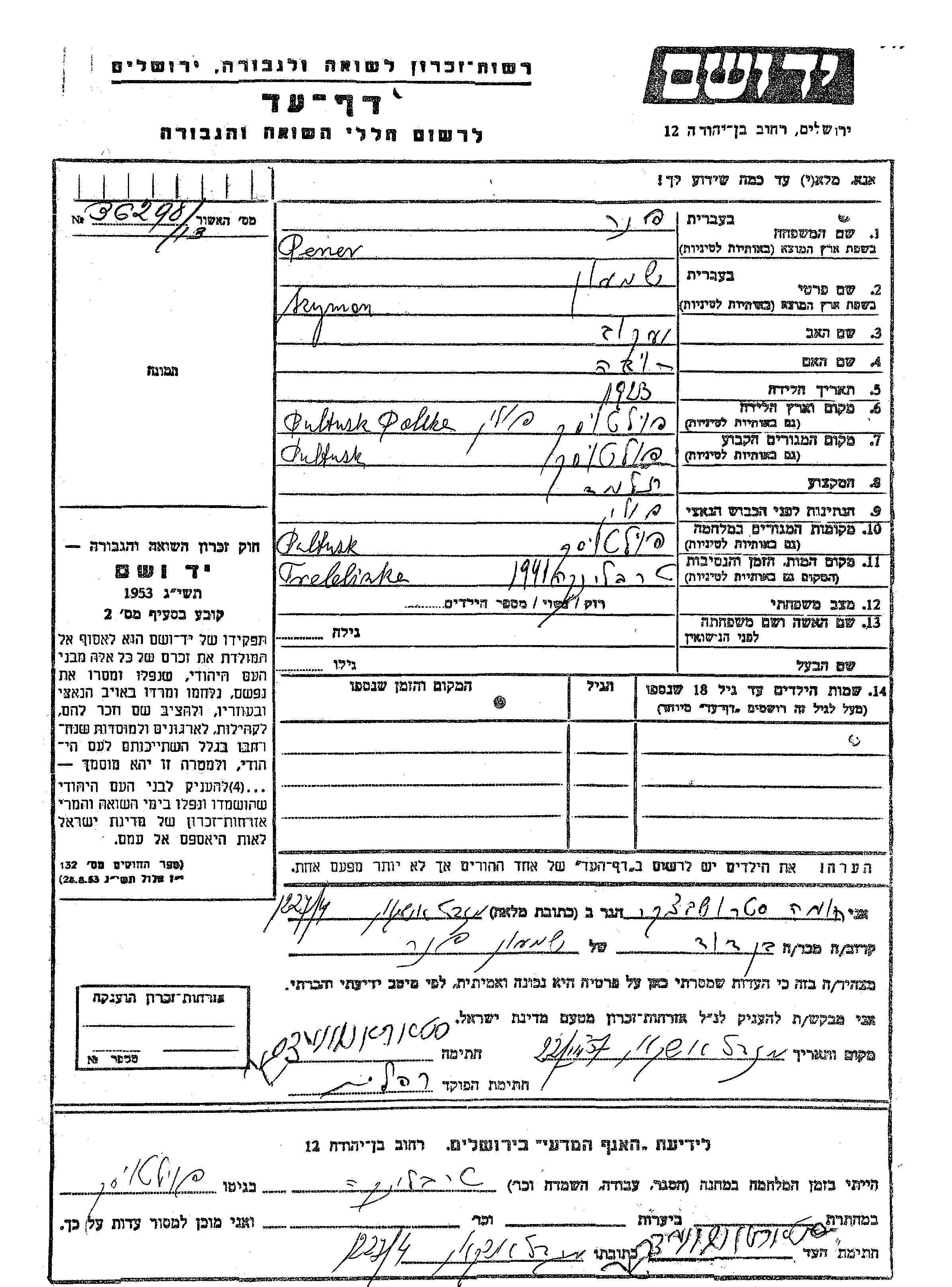 Szymon Pener wurde im Jahr 1923 in Pultusk, Polen geboren. Er war der Sohn von Yaakov und Ida. Er war Schüler/-in und Ledig. Vor dem Zweiten Weltkrieg lebte er in Pultusk, Polen. Während des Krieges war er in Pultusk, Polen.