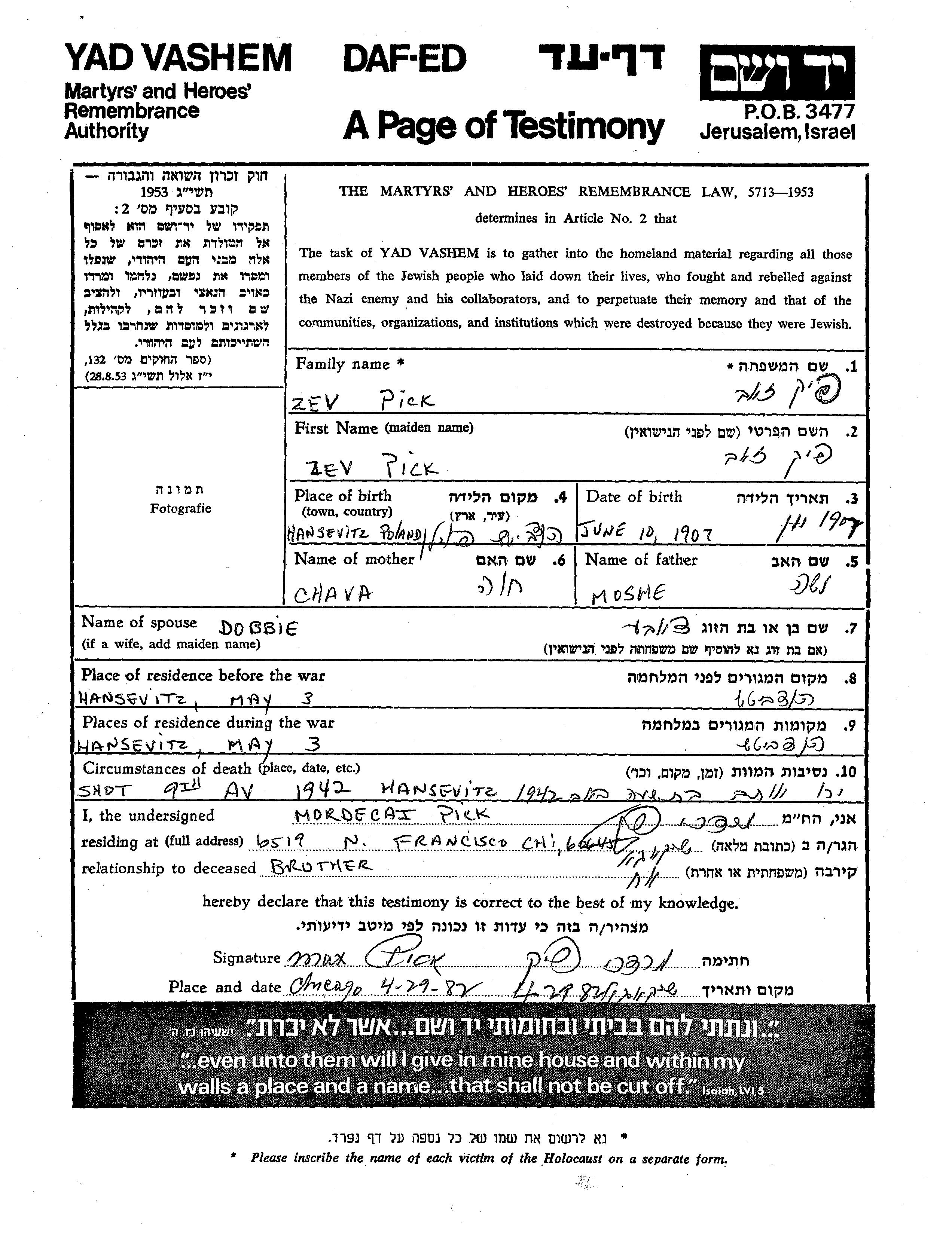 Zeev Pick wurde im Jahr 1907 in Hancewicze, Polen geboren. Er war der Sohn von Moshe und Chava. Er war mit Dobbie Verheiratet. Vor dem Zweiten Weltkrieg lebte er in Hancewicze, Polen. Während des Krieges war er in Hancewicze, Polen.