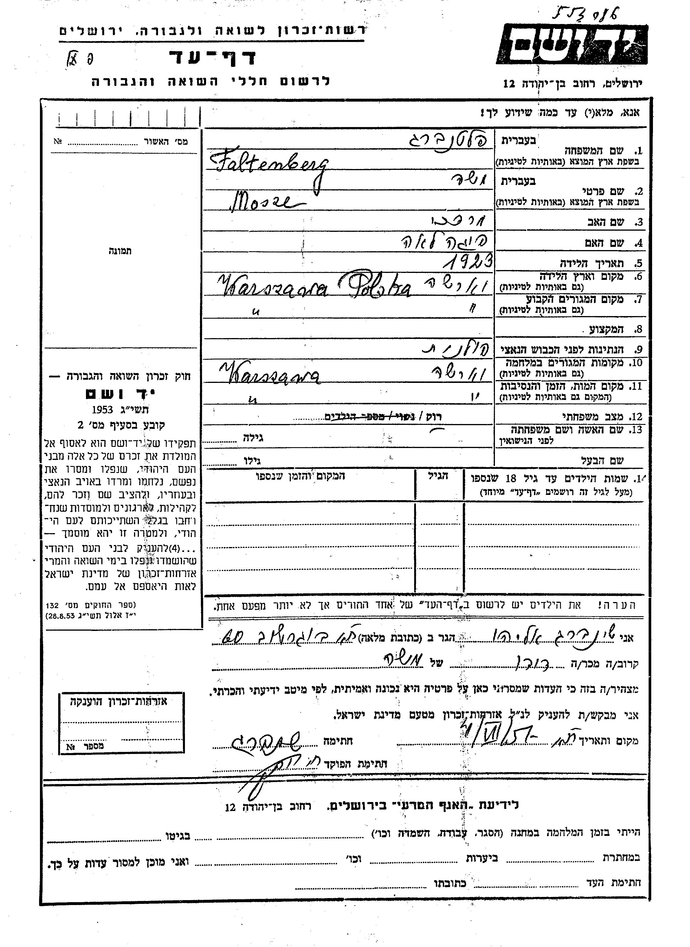 Mosze Faltenberg wurde im Jahr 1923 in Warsaw, Polen geboren. Er war der Sohn von Mordekhai und Feiga Lea. Er war Ledig. Vor dem Zweiten Weltkrieg lebte er in Warsaw, Polen. Während des Krieges war er in Warsaw, Polen.