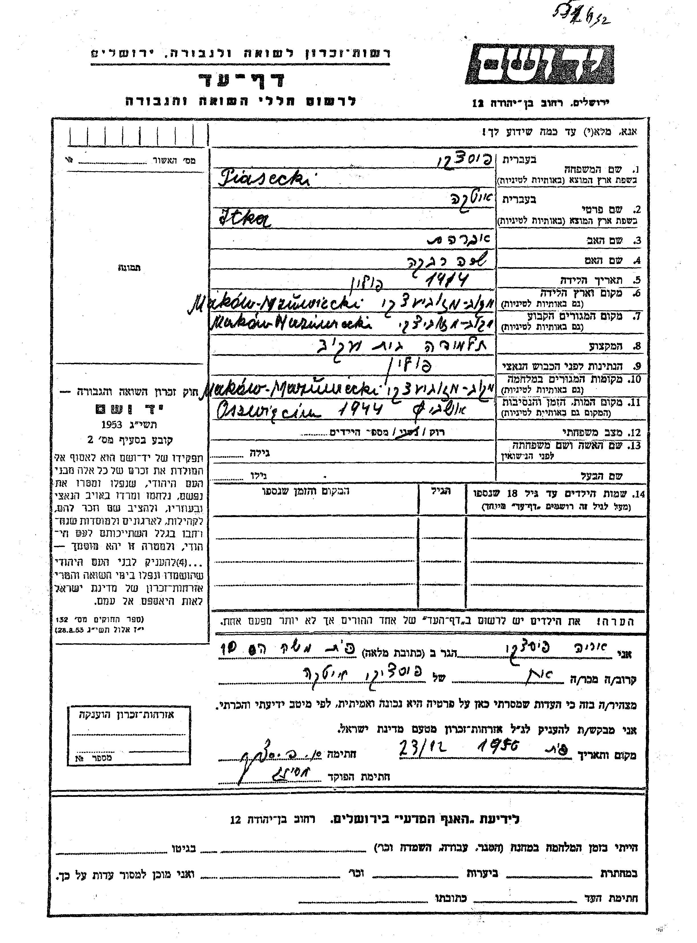 Itka Piasecki Pisetzki wurde im Jahr 1914 in Makow Mazowiecki, Polen geboren. Sie war die Tochter von Avraham und Sara Rivka. Sie war Schüler/-in und Ledig. Vor dem Zweiten Weltkrieg lebte sie in Makow Mazowiecki, Polen. Während des Krieges war sie in Makow Mazowiecki, Polen.