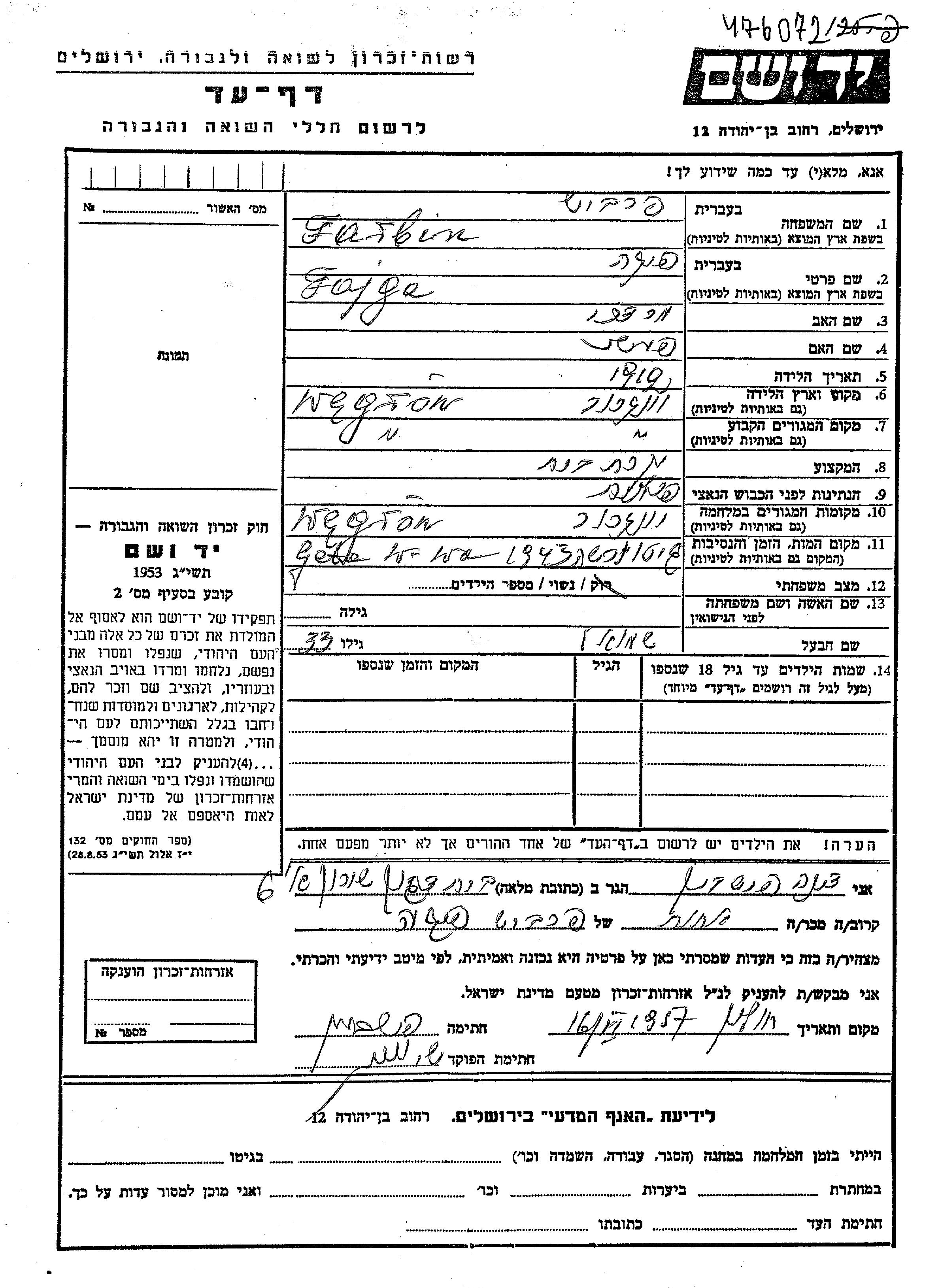 Fajga Farbisz wurde im Jahr 1912 in Wegrow, Polen geboren. Sie war die Tochter von Mordekhai und Pesia. Sie war Hausfrau und mit Shmuel Verheiratet. Vor dem Zweiten Weltkrieg lebte sie in Wegrow, Polen. Während des Krieges war sie in Wegrow, Polen.