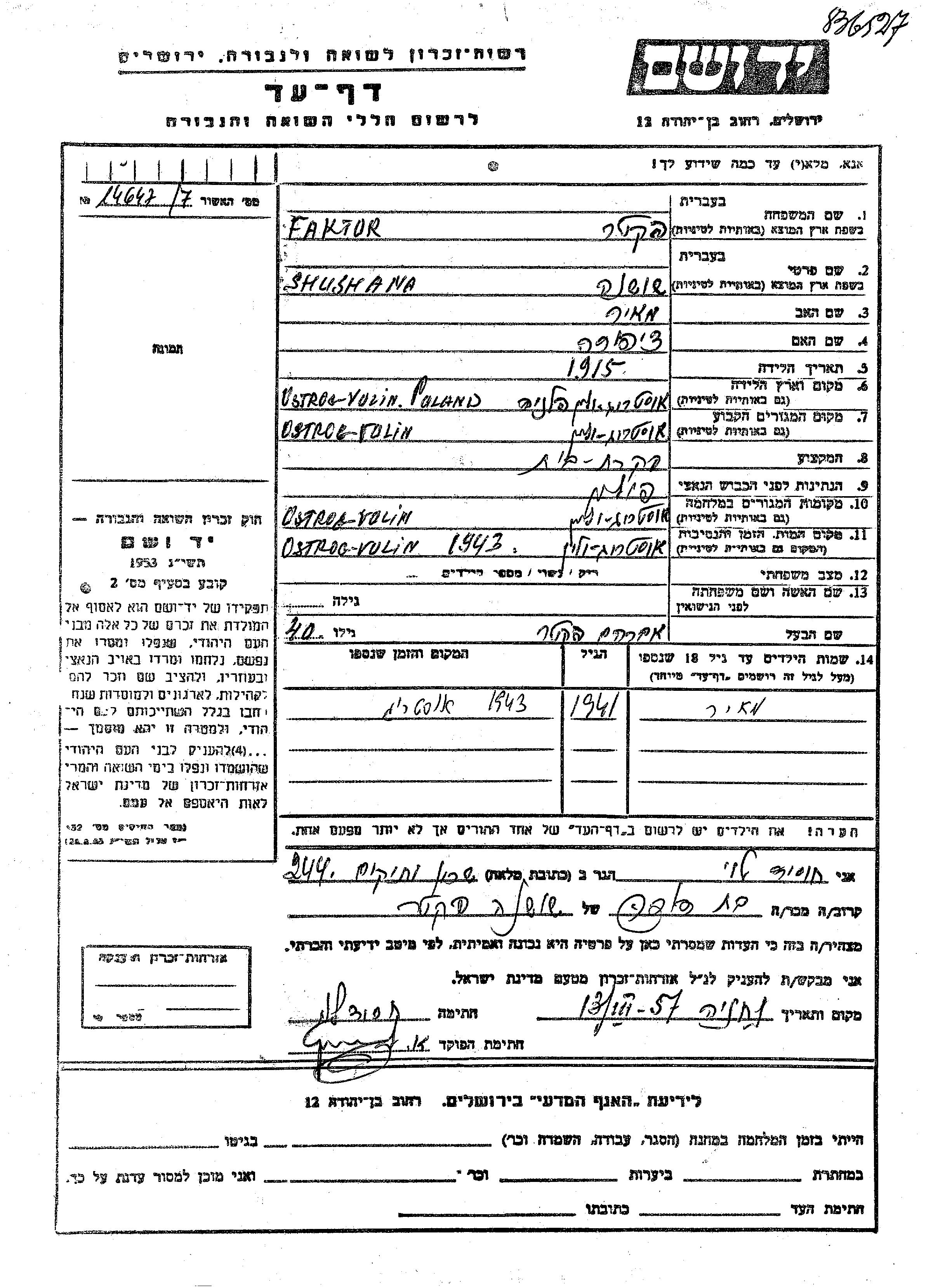 Shushana Faktor Pakter wurde im Jahr 1915 in Ustrug, Polen geboren. Sie war die Tochter von Meir und Tzipora. Sie war Hausfrau und mit Avraham Verheiratet. Vor dem Zweiten Weltkrieg lebte sie in Ustrug, Polen. Während des Krieges war sie in Ustrug, Polen.