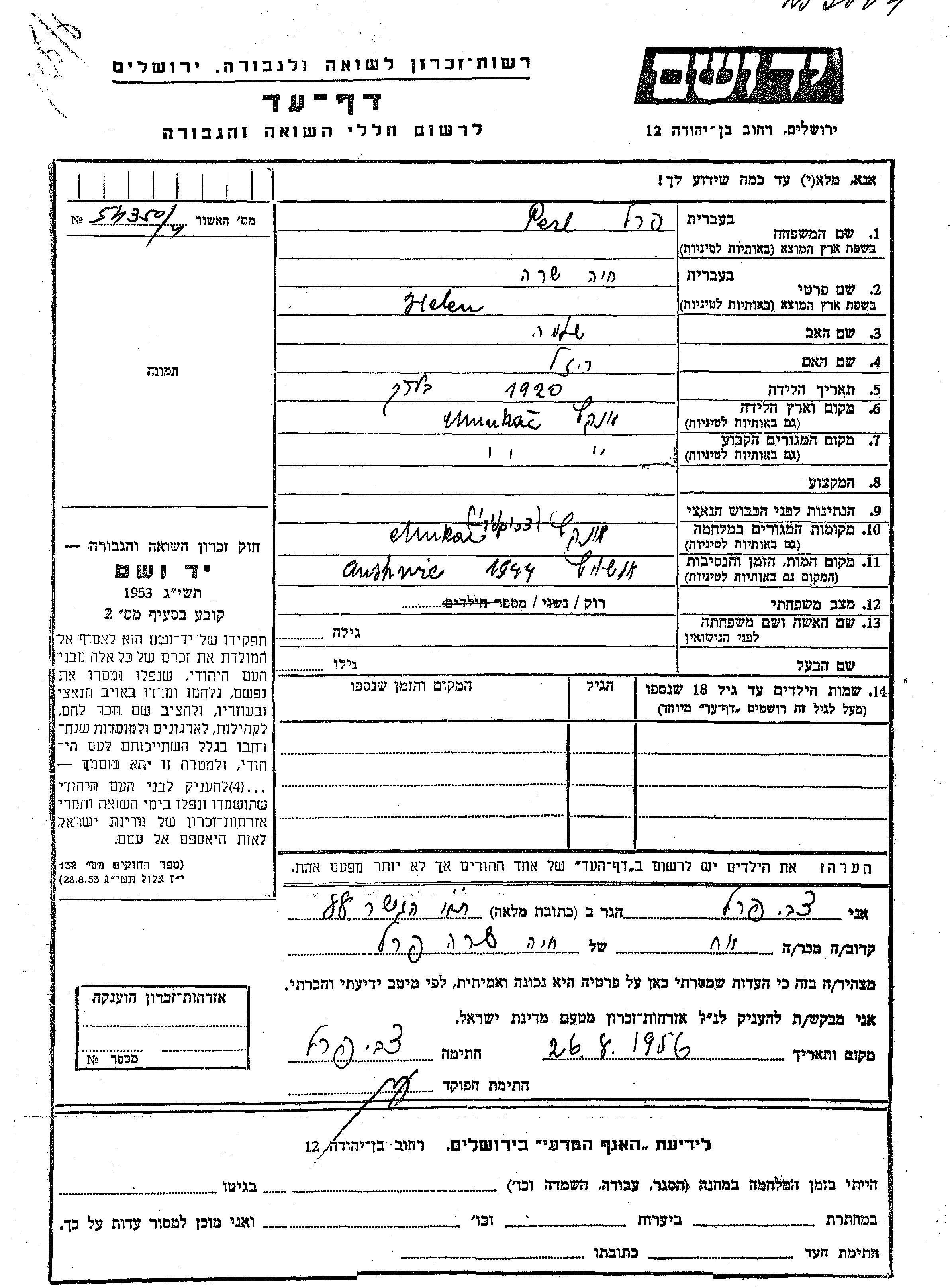 Khaia Sara Perl wurde im Jahr 1920 in Munkac, Tschechoslowakei geboren. Sie war die Tochter von Shlomo und Reizel. Sie war Ledig. Vor dem Zweiten Weltkrieg lebte sie in Munkac, Tschechoslowakei. Während des Krieges war sie in Munkac, Tschechoslowakei.