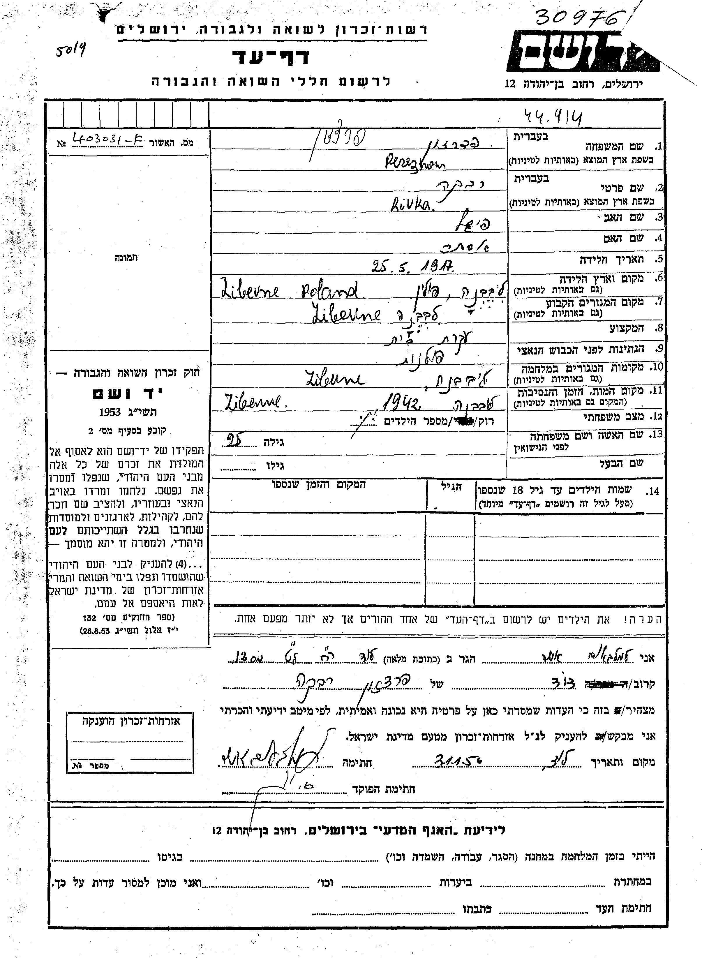 Rivka Perezhon Fredzon wurde im Jahr 1917 in Libevne, Polen geboren. Sie war die Tochter von Fishel und Ester. Sie war Hausfrau und Ledig. Vor dem Zweiten Weltkrieg lebte sie in Libevne, Polen. Während des Krieges war sie in Libevne, Polen.