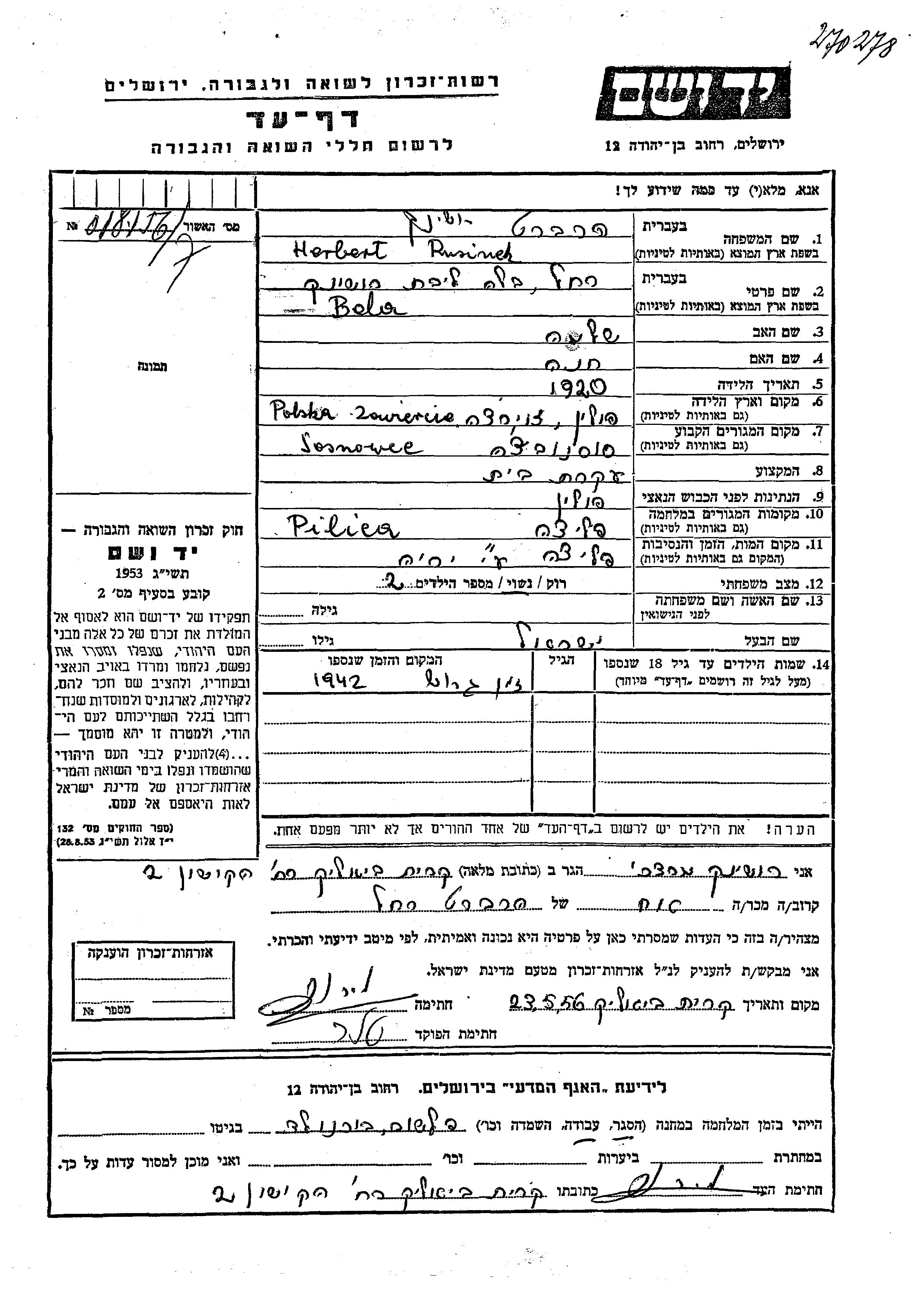Rakhel Bela Herbert, geb. Rusinek wurde im Jahr 1920 in Zawierce, Polen geboren. Sie war die Tochter von Shlomo und Khana. Sie war Hausfrau und mit Yisrael Verheiratet. Vor dem Zweiten Weltkrieg lebte sie in Sosnowce, Polen. Während des Krieges war sie in Pilica, Polen.