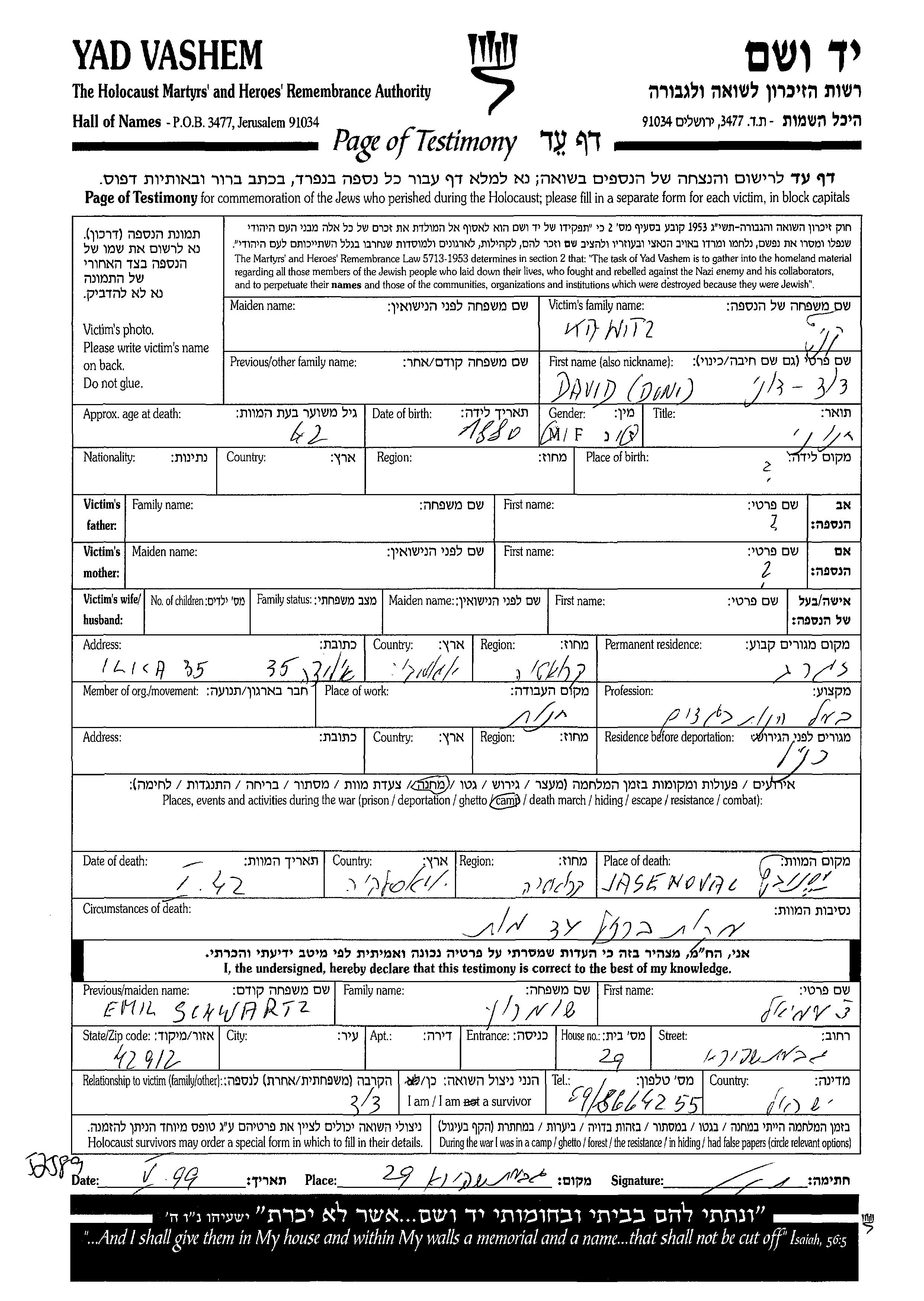 Doni David wurde in der Schoah ermordet. Todesort: Jasenovac, Jugoslawien im Jahr 01/1942.