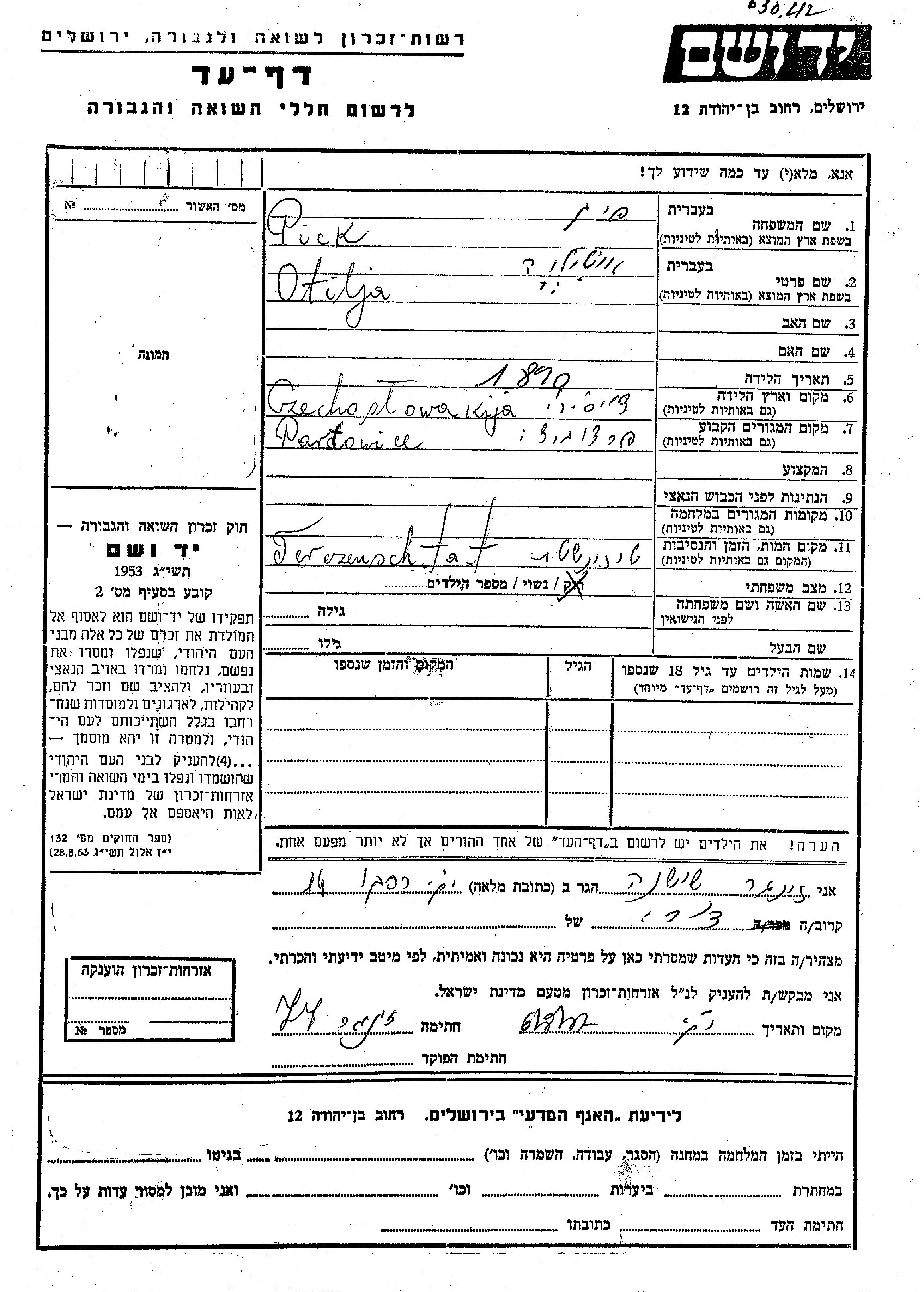 Otilja Pick wurde im Jahr 1890 in Tschechoslowakei geboren. Sie war Verheiratet. Vor dem Zweiten Weltkrieg lebte sie in Pardubice, Tschechoslowakei.