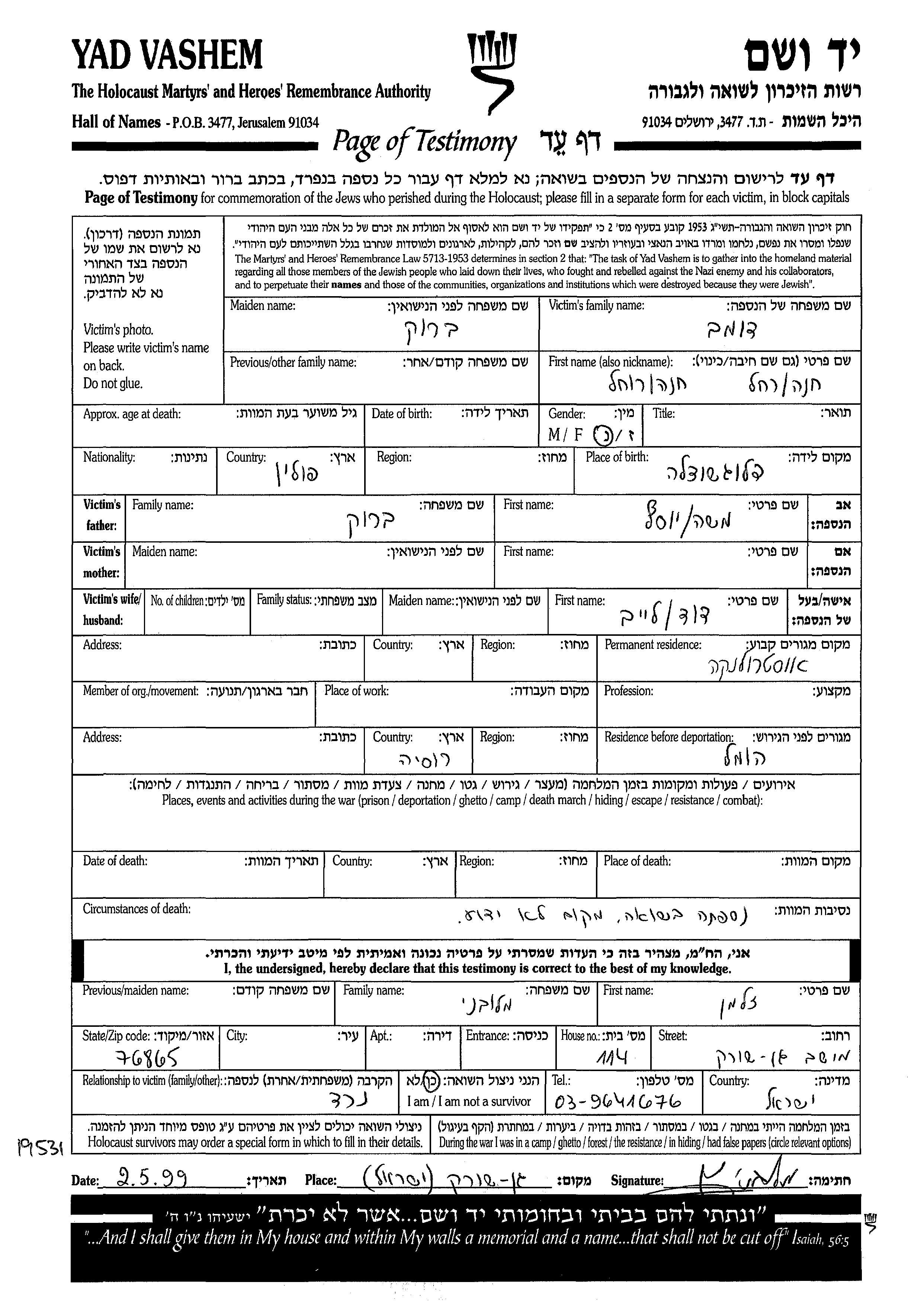 Khana Rakhel Domb, geb. Bruk wurde in Dlugasodlo, Polen geboren. Sie war die Tochter von Moshe Yosef. Sie war mit David Leib Verheiratet. Vor dem Zweiten Weltkrieg lebte sie in Ostrolenka, Polen. Während des Krieges war sie in Homel, Weißrussland (UdSSR).