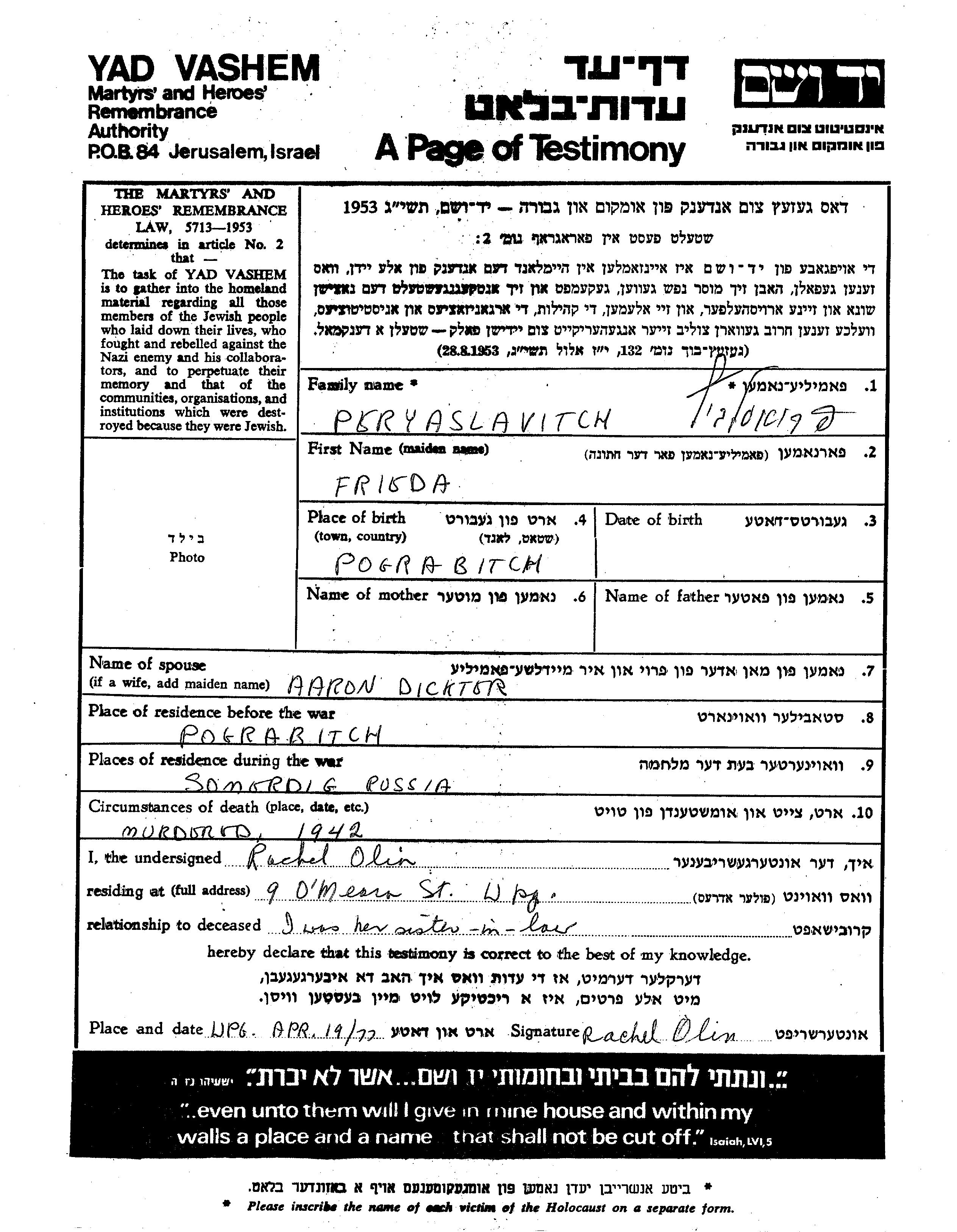 Frieda Dickter, geb. Peryaslavitch wurde in Pogrebisce, Ukraine (UdSSR) geboren. Sie war mit Aaron Verheiratet. Vor dem Zweiten Weltkrieg lebte sie in Pogrebisce, Ukraine (UdSSR). Während des Krieges war sie in Somordig.