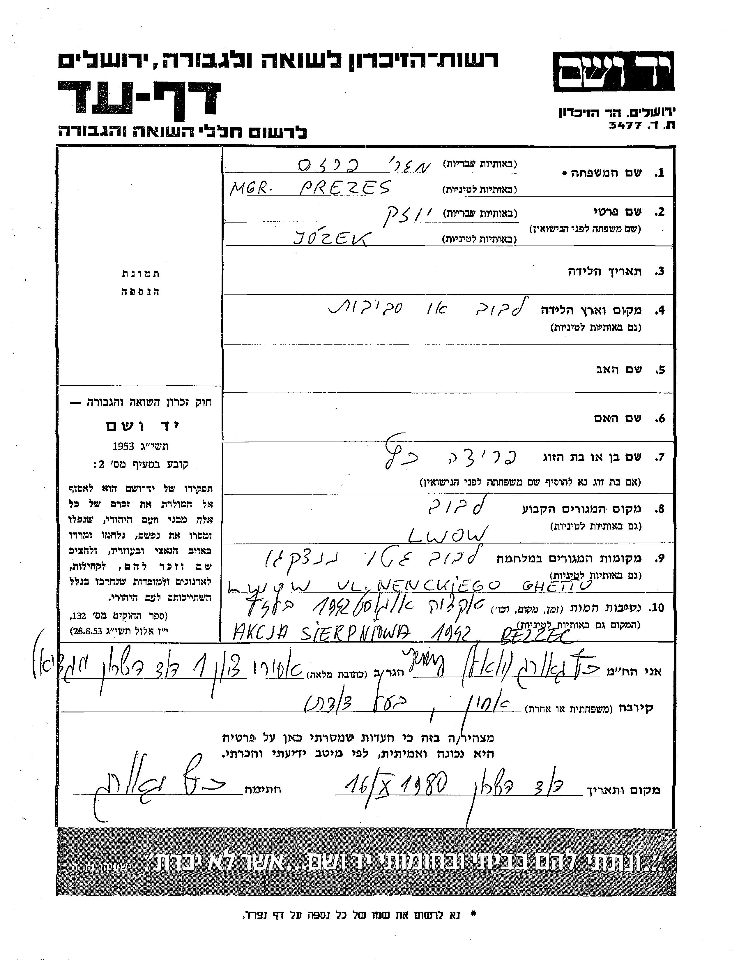 Magister Jozek Prezes wurde in Lvov, Polen geboren. Er war mit Frida, geb. Katz Verheiratet. Vor dem Zweiten Weltkrieg lebte er in Lwow, Polen. Während des Krieges war er in Lwow, Polen.