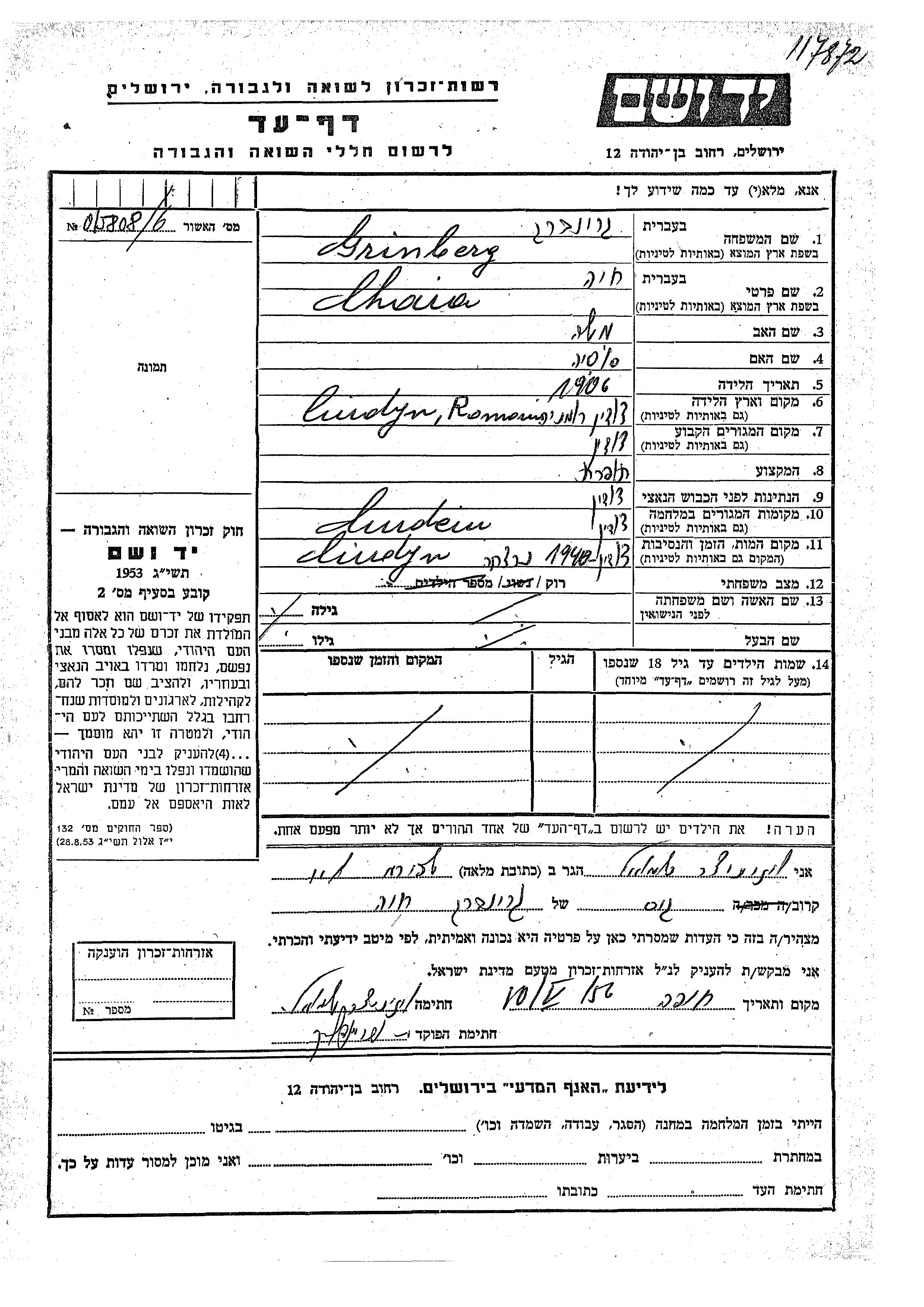 Chaia Grinberg wurde im Jahr 1906 in Ciudyn, Rumänien geboren. Sie war die Tochter von Moshe und Sosia. Sie war Schneiderin und Ledig. Vor dem Zweiten Weltkrieg lebte sie in Ciudyn, Rumänien. Während des Krieges war sie in Ciudyn, Rumänien.