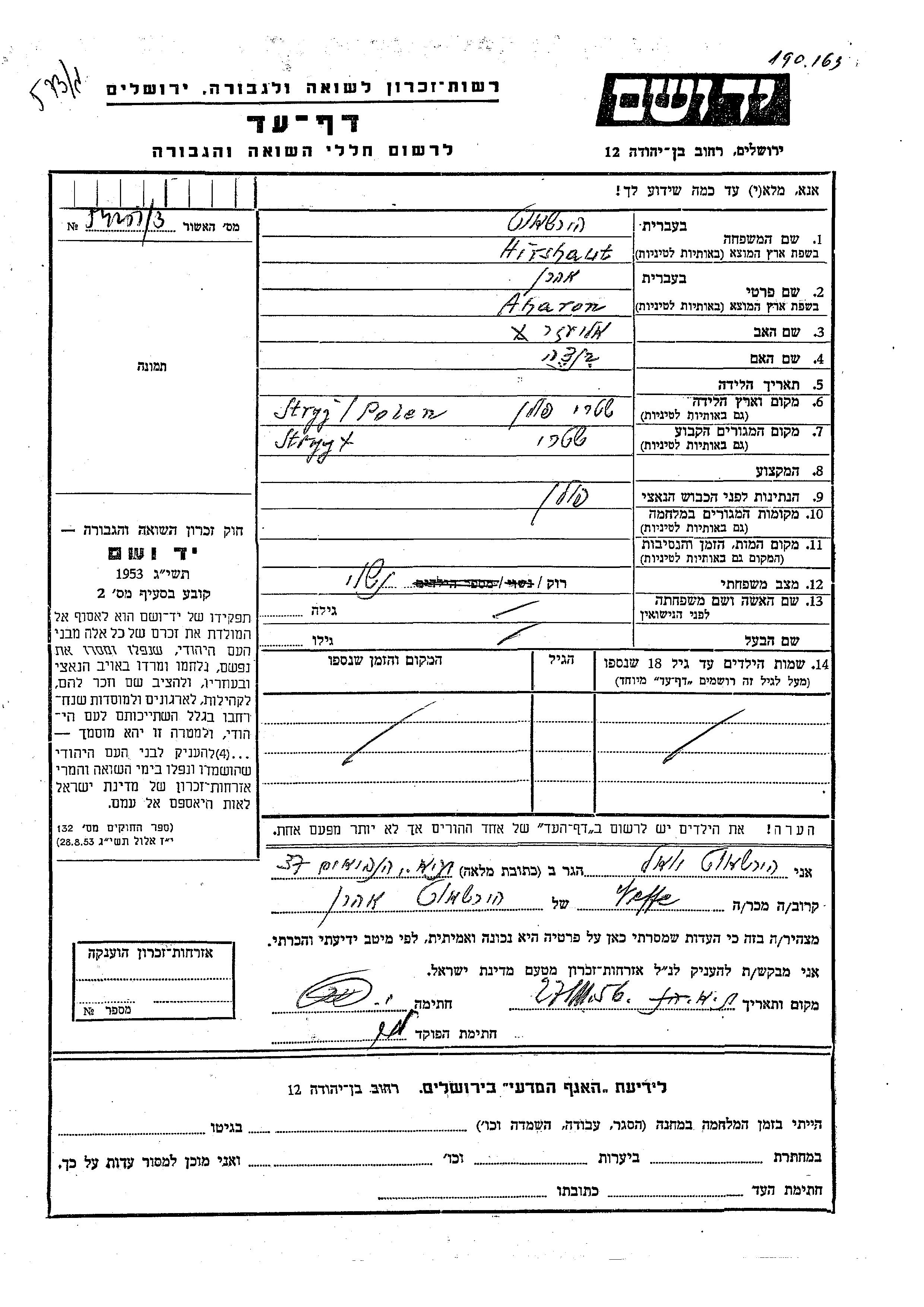Hirshaut Aharon Stryy, Polen Gedenkblatt