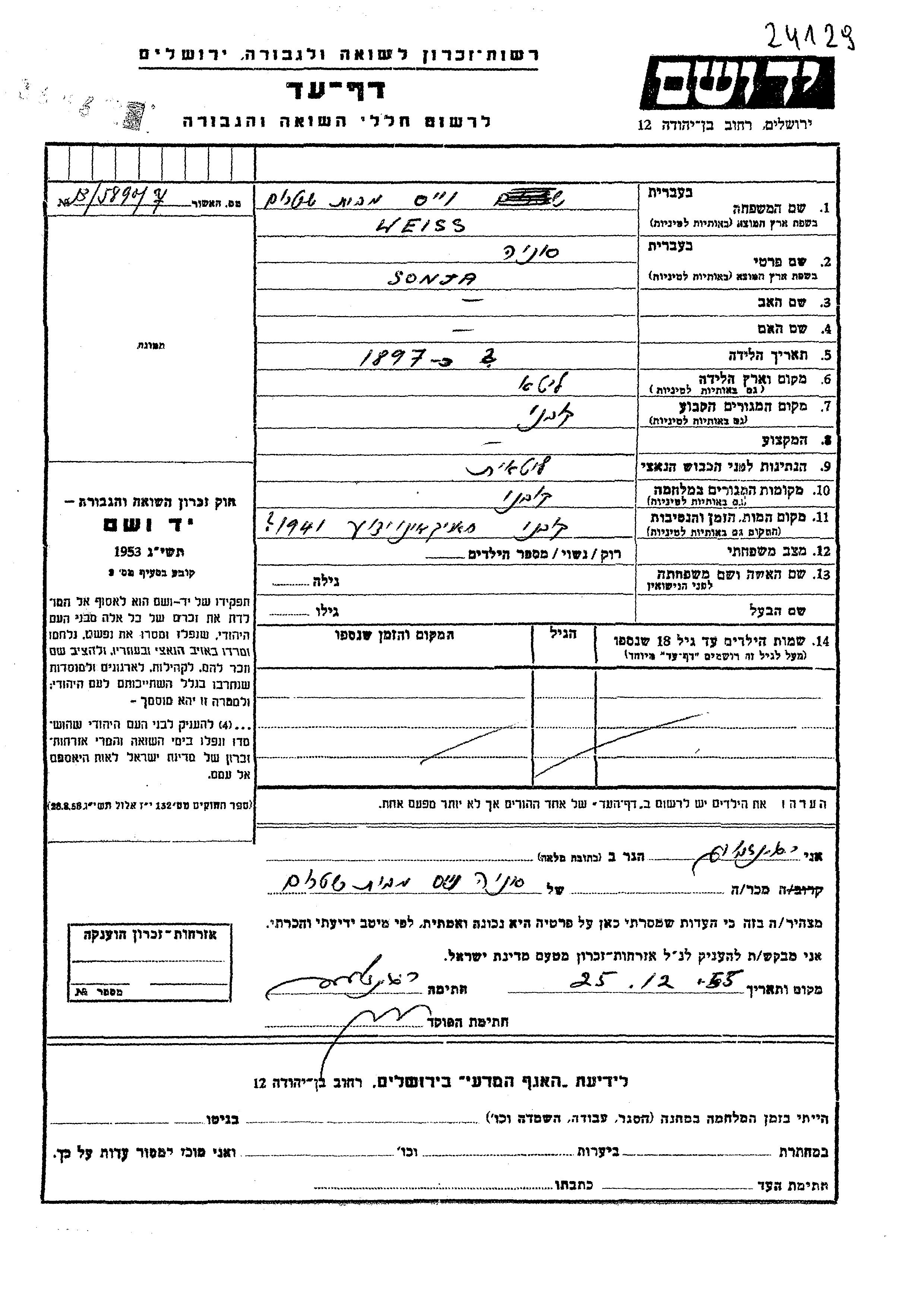 Sonya Weiss, geb. Shtrum wurde im Jahr 1897 in Litauen geboren. Vor dem Zweiten Weltkrieg lebte sie in Kovno, Litauen. Während des Krieges war sie in Kovno, Litauen.