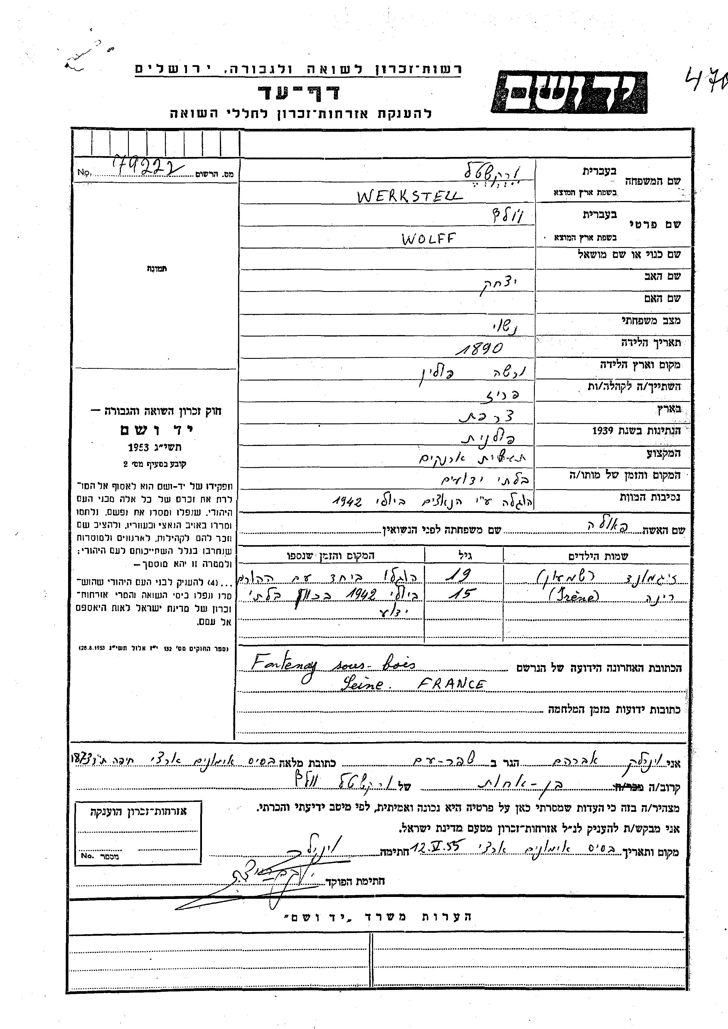 Wolf Werkstell wurde im Jahr 1890 in Warsaw, Polen geboren. Er war der Sohn von Yitzkhak. Er war mit Paula Verheiratet.