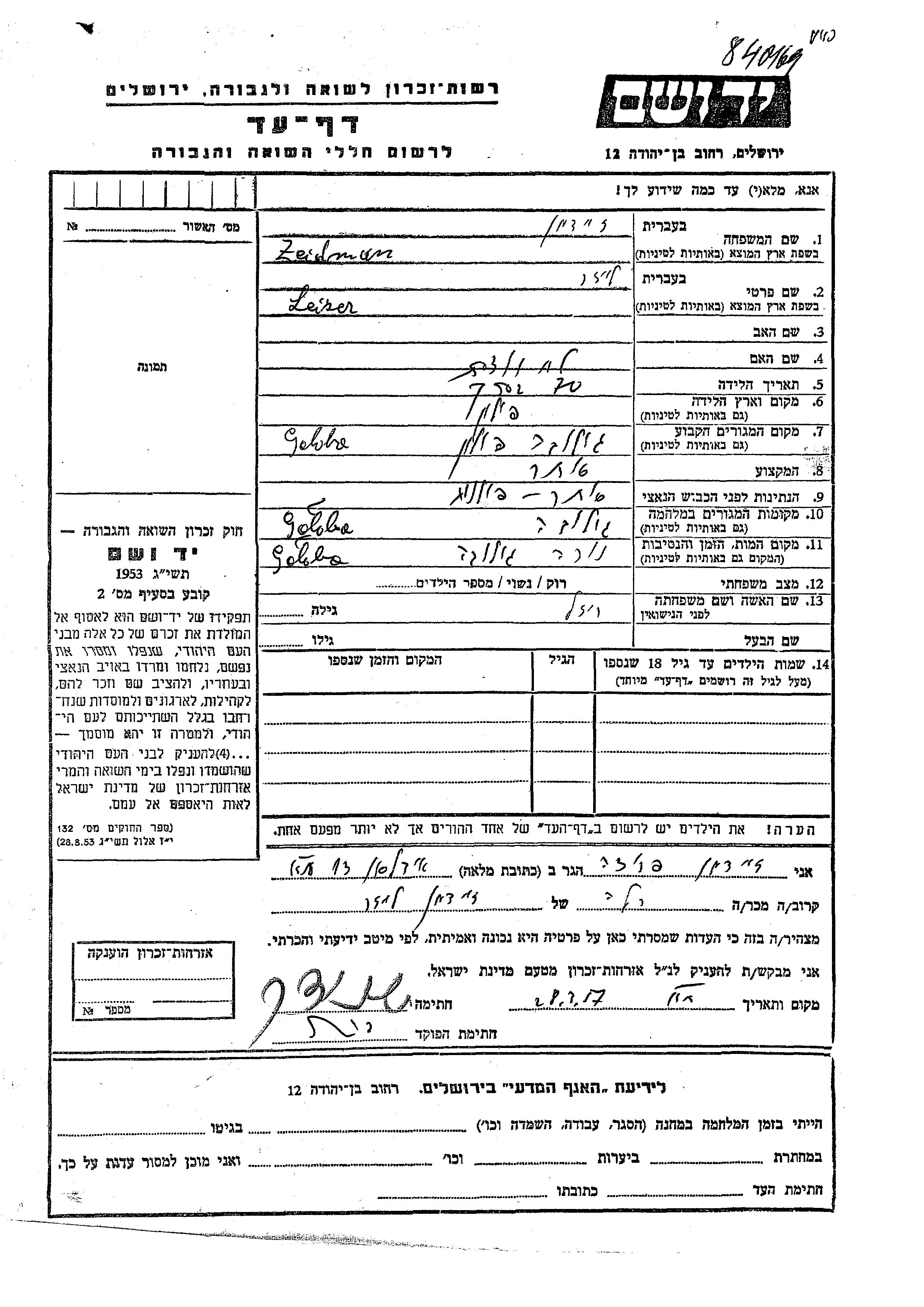 Leizer wurde in der Schoah ermordet. Todesort: Golobi, Polen.