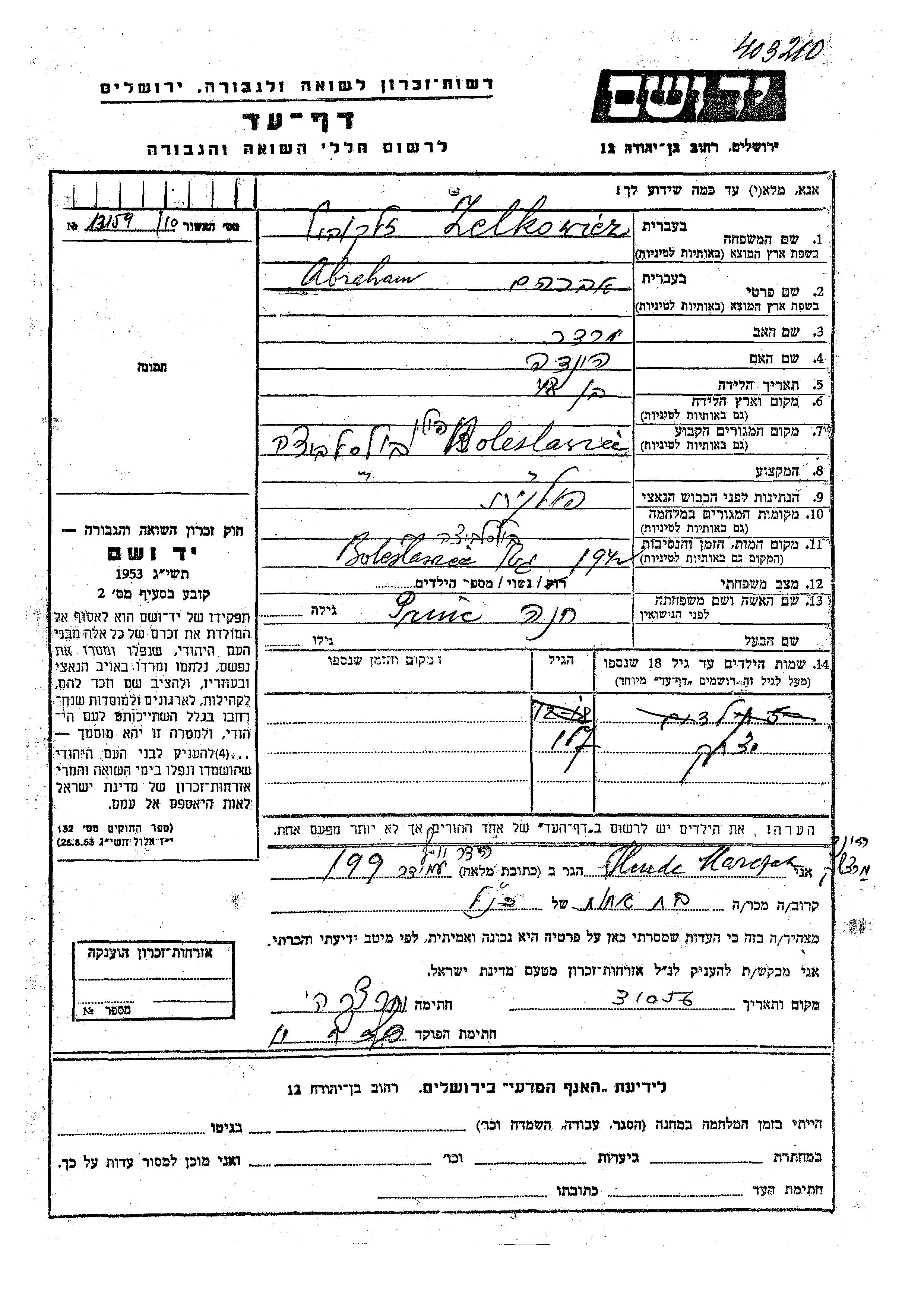 Abraham Zelkowicz wurde Er war der Sohn von Mordekhai und Hinda. Er war mit Khana, geb. Princ Verheiratet. Vor dem Zweiten Weltkrieg lebte er in Boleslawiec, Polen. Während des Krieges war er in Boleslawiec, Polen.