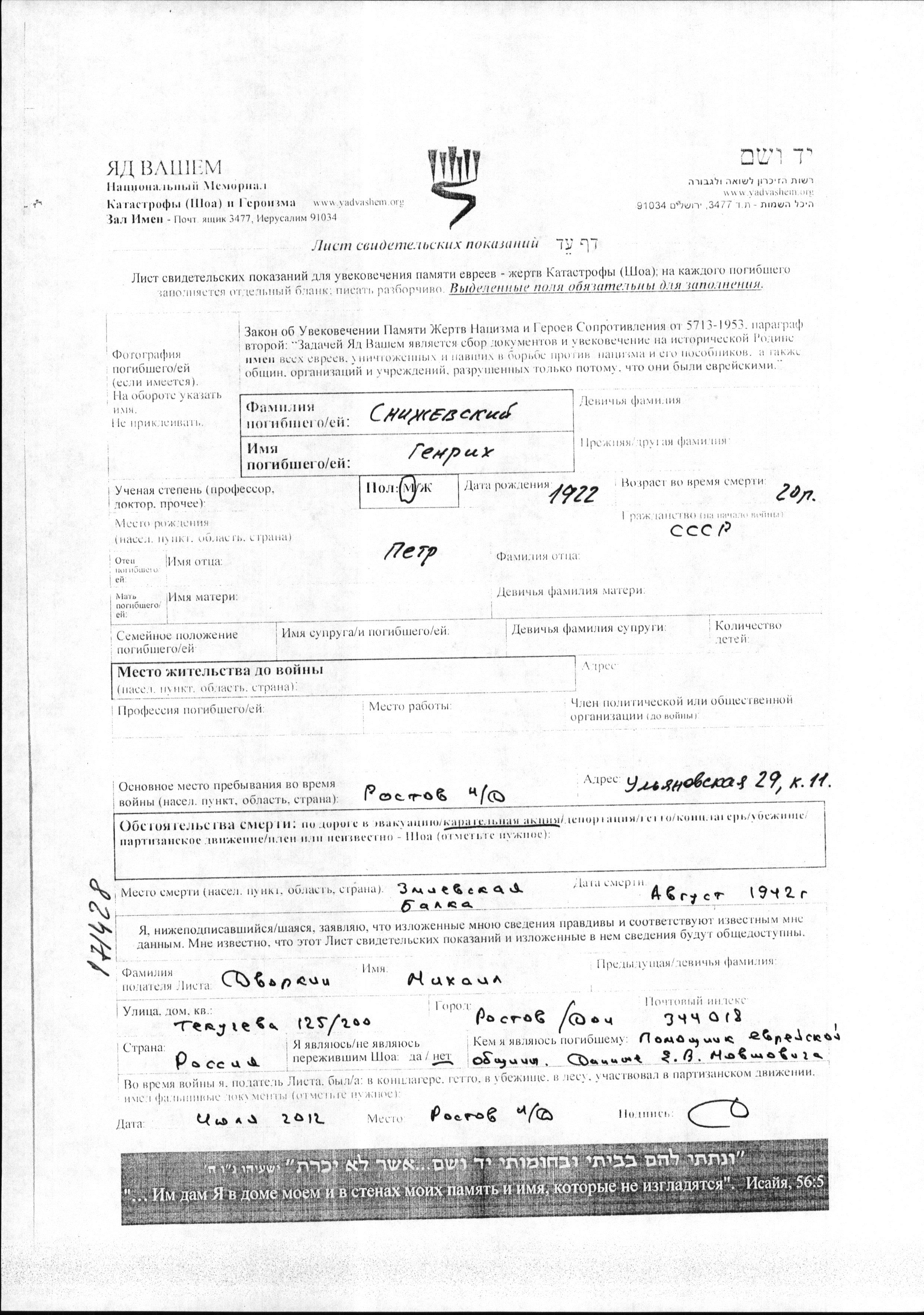 Genrikh wurde in der Schoah ermordet. Todesort: Zmiyevskaya Balka (Rostov Area), Massaker Ort im Jahr 12/08/1942.