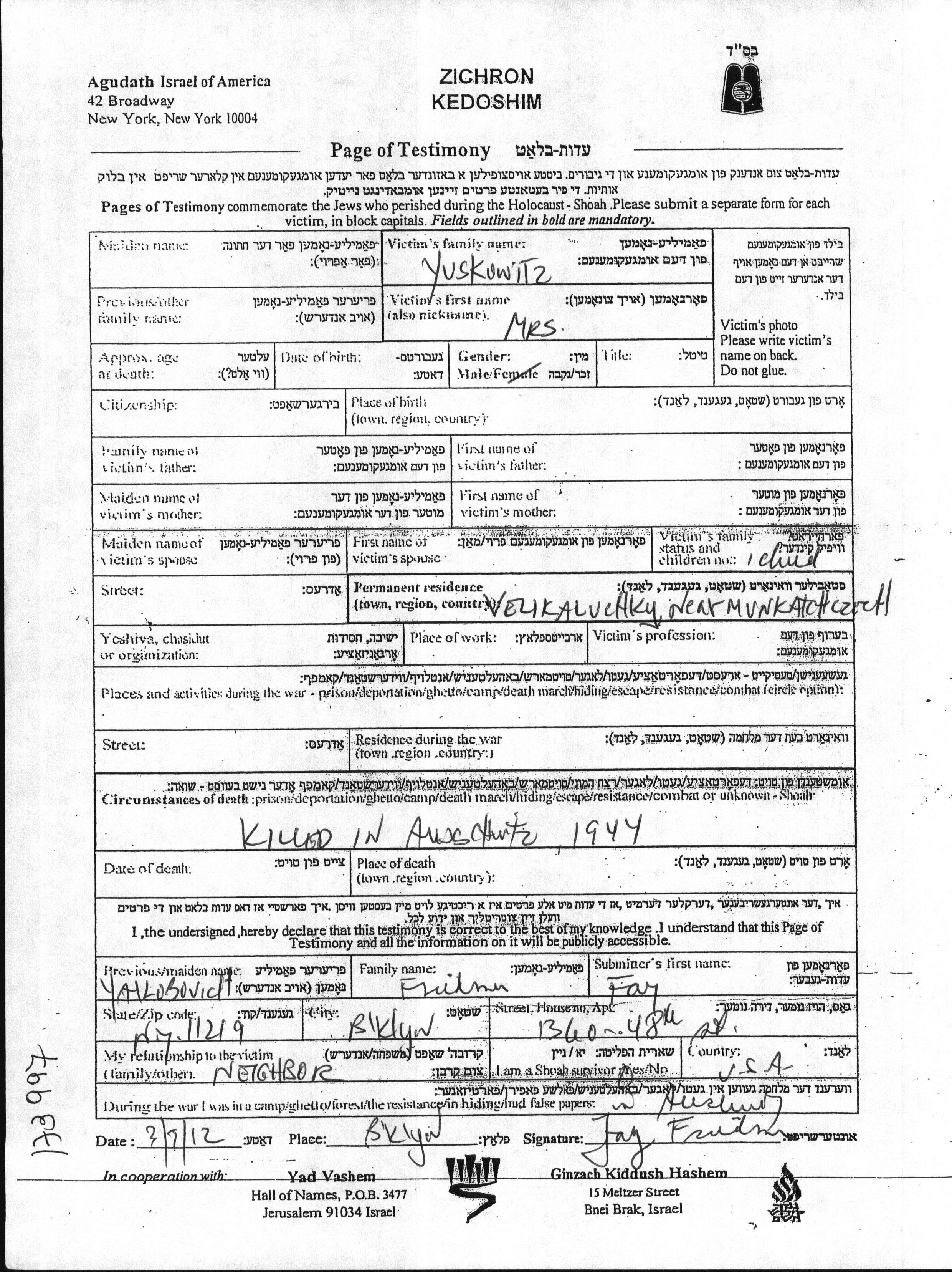 Vorname unbekannt Yuskowitz. Sie war Verheiratet. Vor dem Zweiten Weltkrieg lebte sie in Velike Loucky, Tschechoslowakei. Während des Krieges war sie in Carpathian Ruthenia, Tschechoslowakei.