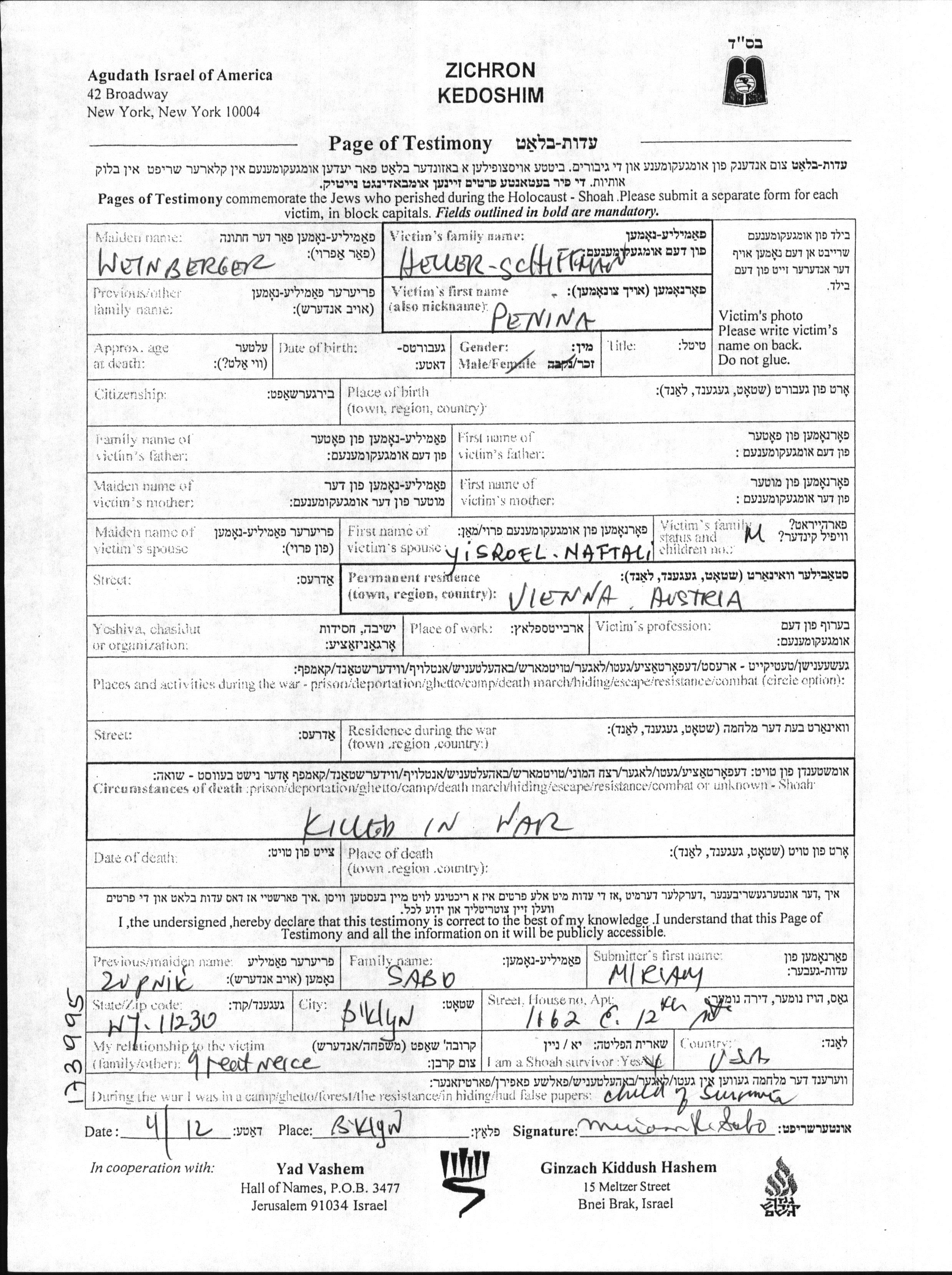 Penina Heuer Schiffmann, geb. Weinberger. Sie war mit Yisroel Naftali Verheiratet. Vor dem Zweiten Weltkrieg lebte sie in Vienna, Österreich.