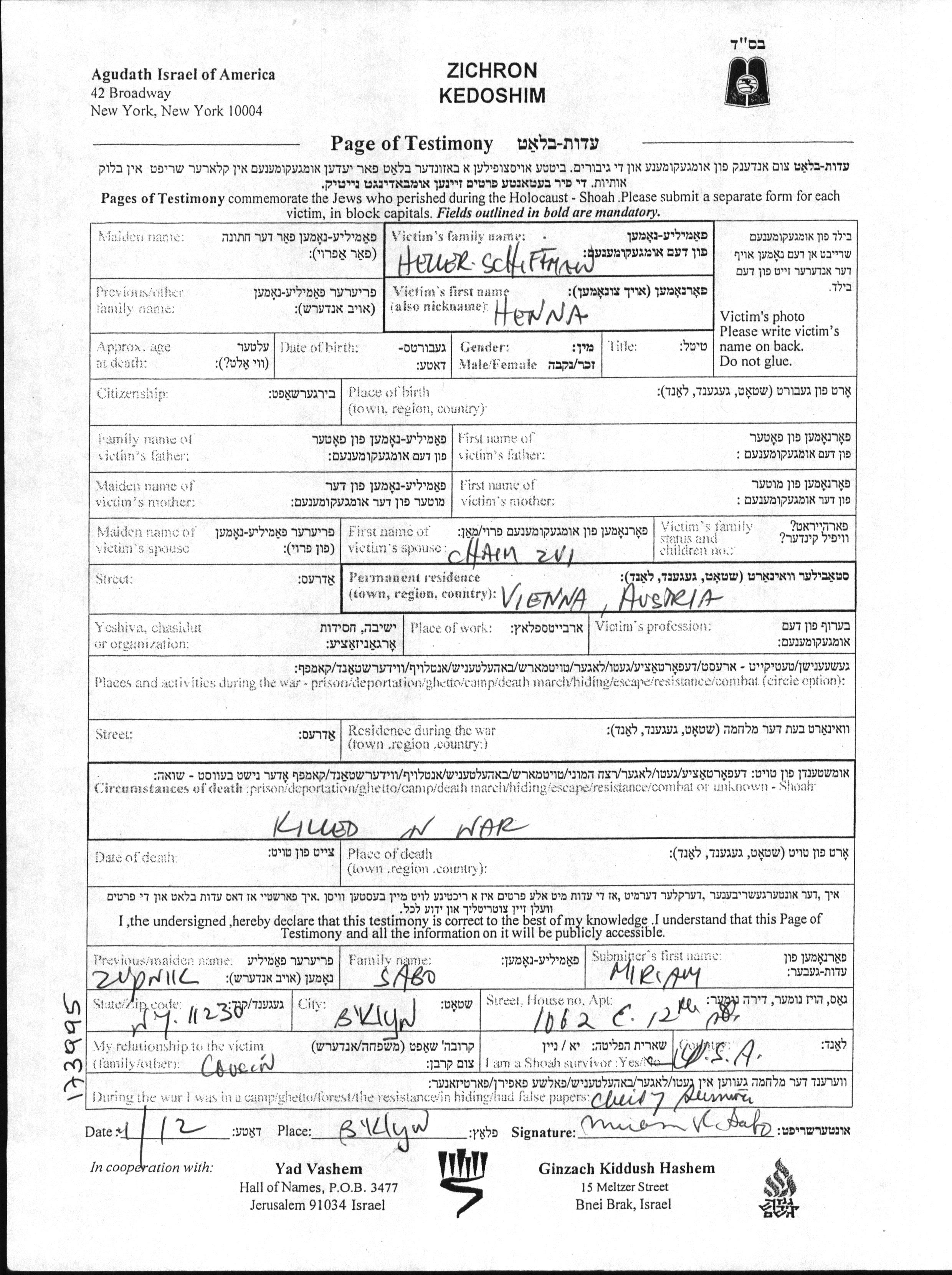 Henna Heller Schiffman. Sie war mit Chaim Zvi Verheiratet. Vor dem Zweiten Weltkrieg lebte sie in Vienna, Österreich.