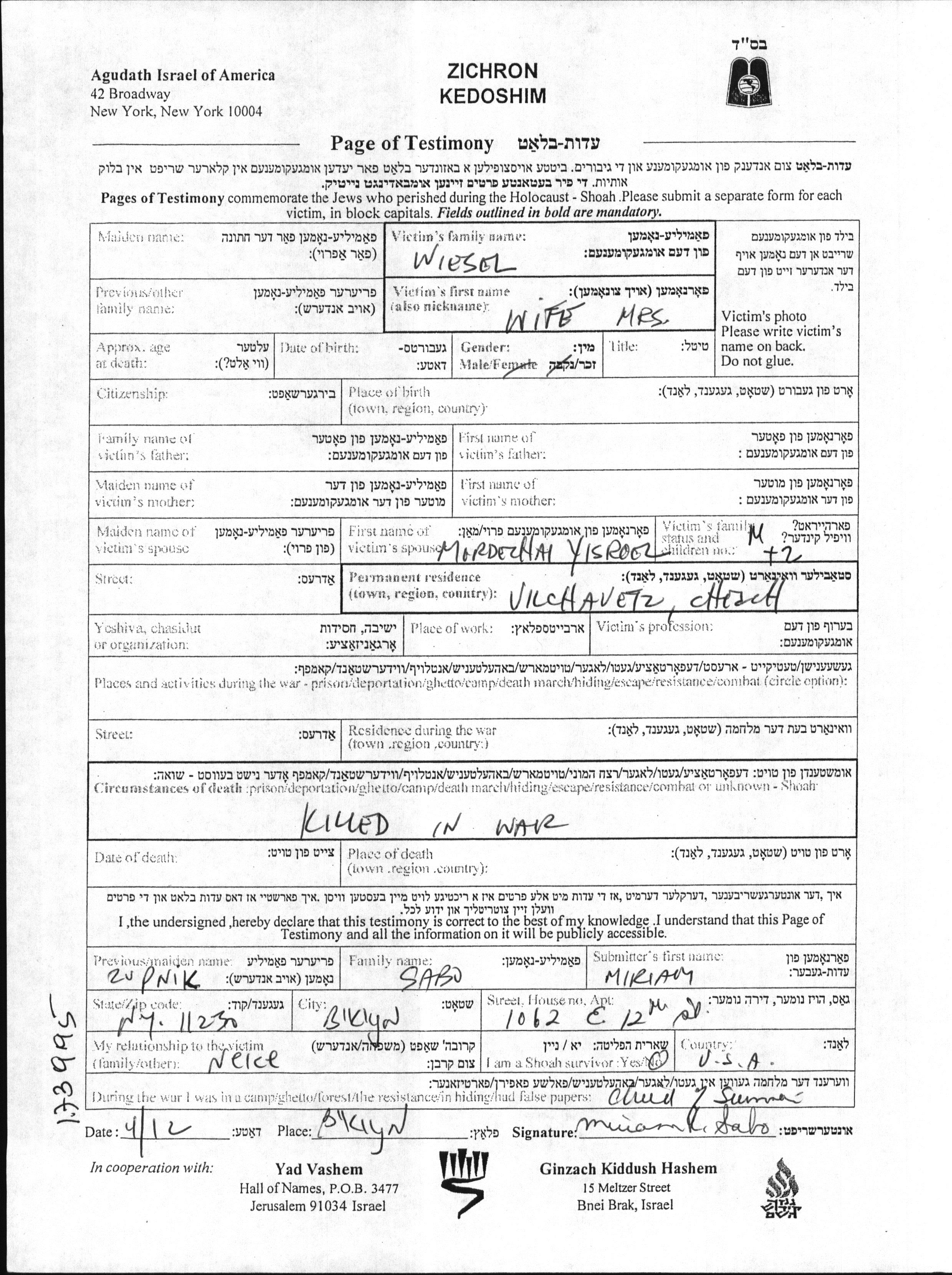 Vorname unbekannt Wiesel. Sie war mit Mordechai Yisroel Verheiratet. Vor dem Zweiten Weltkrieg lebte sie in Vilhovitz, Tschechoslowakei.