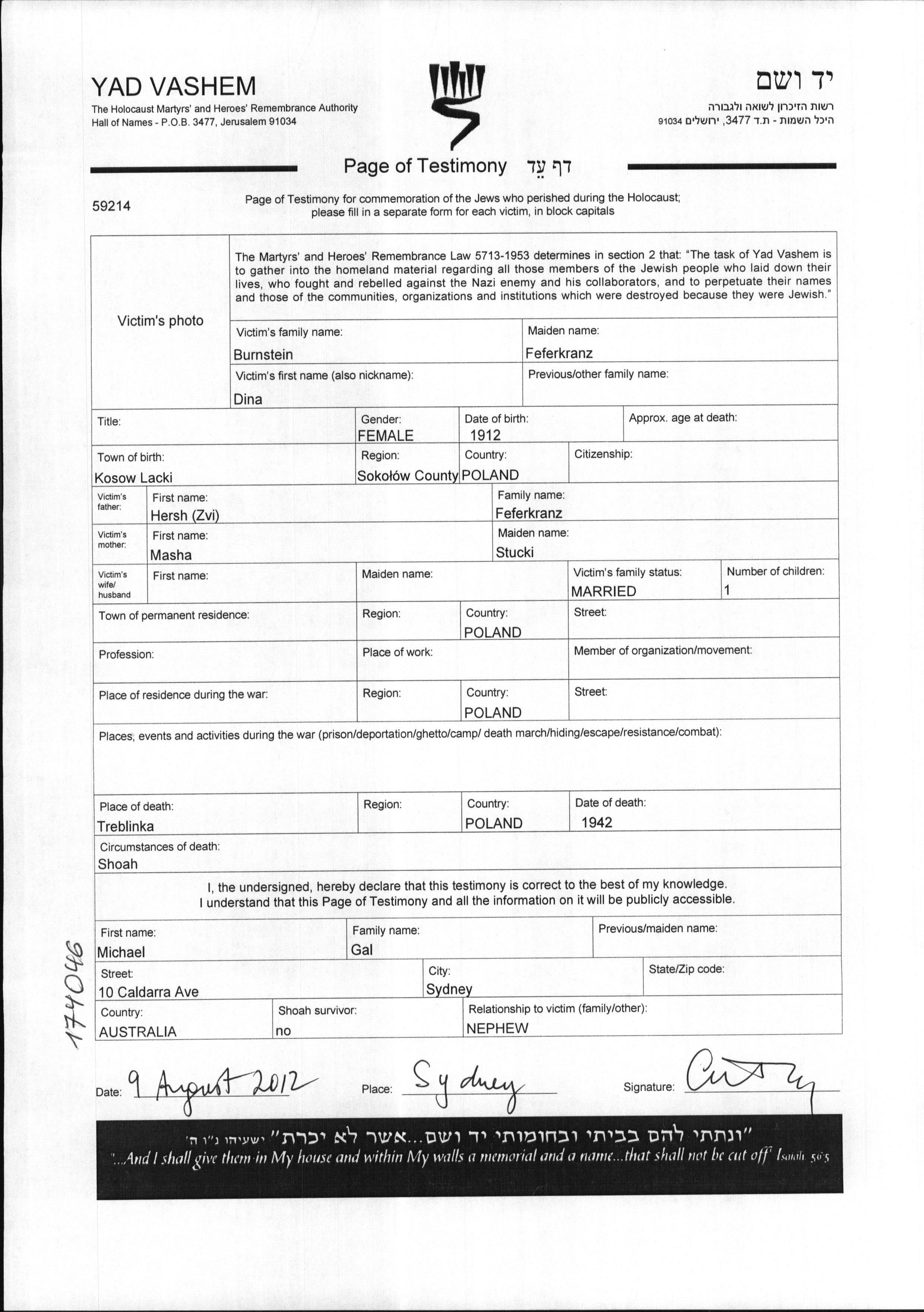 Dina Burnstein, geb. Feferkranz wurde im Jahr 1912 in Kosow Lacki, Polen geboren. Sie war die Tochter von Hersh Zvi und Masha, geb. Stucki. Sie war Verheiratet. Vor dem Zweiten Weltkrieg lebte sie in Polen. Während des Krieges war sie in Polen.