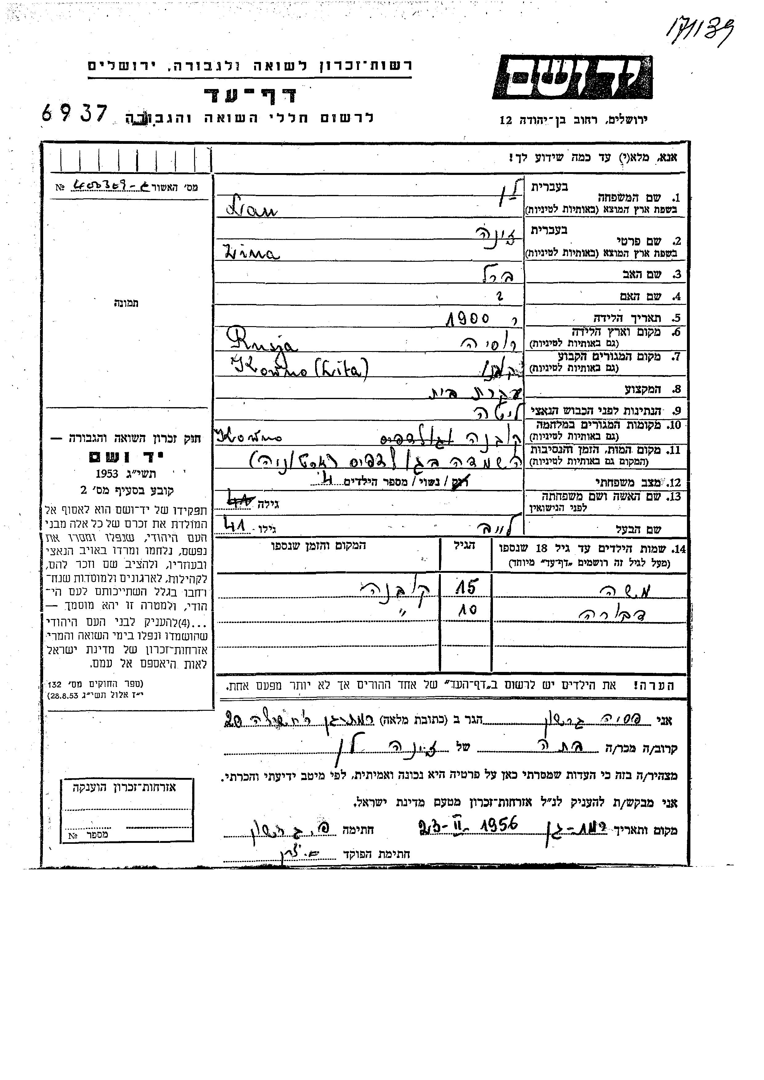 Zina Lan wurde im Jahr 1900 in Russland (UdSSR) geboren. Sie war die Tochter von Berl. Sie war Hausfrau und mit Leib Verheiratet. Vor dem Zweiten Weltkrieg lebte sie in Kowno, Litauen. Während des Krieges war sie in Kowno, Litauen.